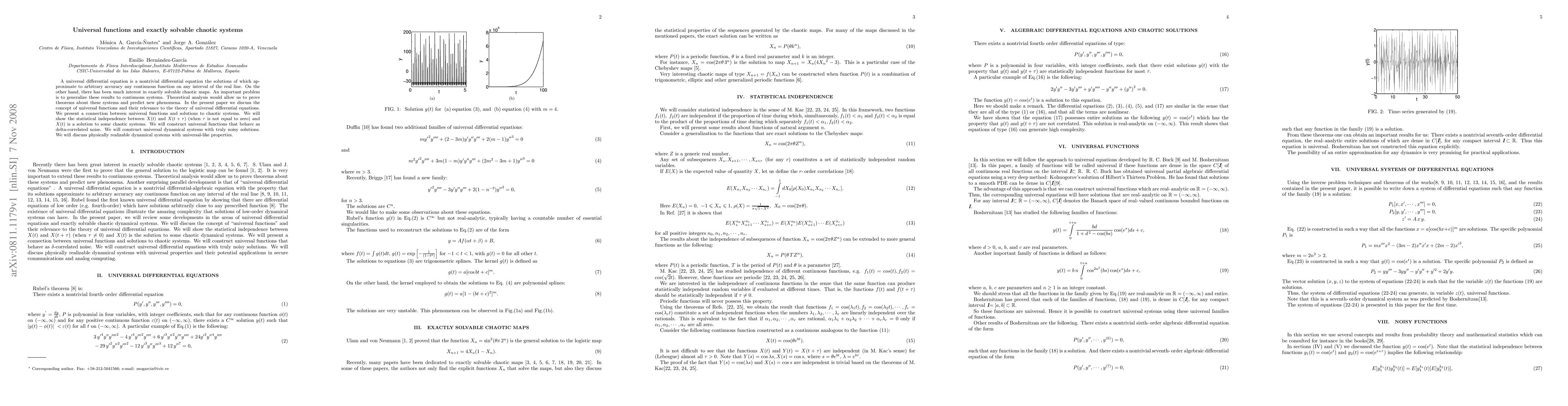 This paper explores the connection between universal functions and exactly solvable chaotic systems, demonstrating statistical independence in chaotic solutions and constructing universal dynamical systems with noisy behavior, aiming to generalize these findings to continuous chaotic systems.