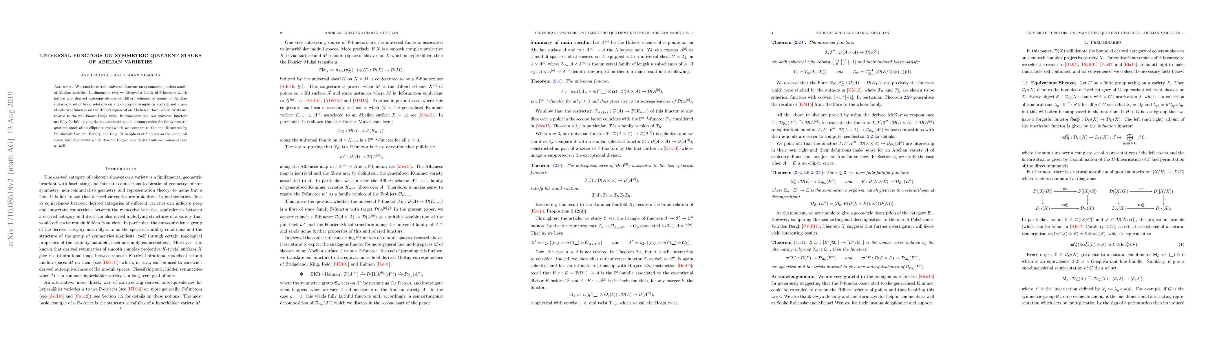 We consider certain universal functors on symmetric quotient stacks of Abelian varieties. In dimension two, we discover a family of $\mathbb{P}$-functors which induce new derived autoequivalences of Hilbert schemes of points on Abelian surfaces; a set of braid relations on a holomorphic symplectic sixfold; and a pair of spherical functors on the Hilbert square of an Abelian surface, whose twists are related to the well-known Horja twist. In dimension one, our universal functors are fully faithful, giving rise to a semiorthogonal decomposition for the symmetric quotient stack of an elliptic curve (which we compare to the one discovered by Polishchuk--Van den Bergh), and they lift to spherical functors on the canonical cover, inducing twists which descend to give new derived autoequivalences here as well.