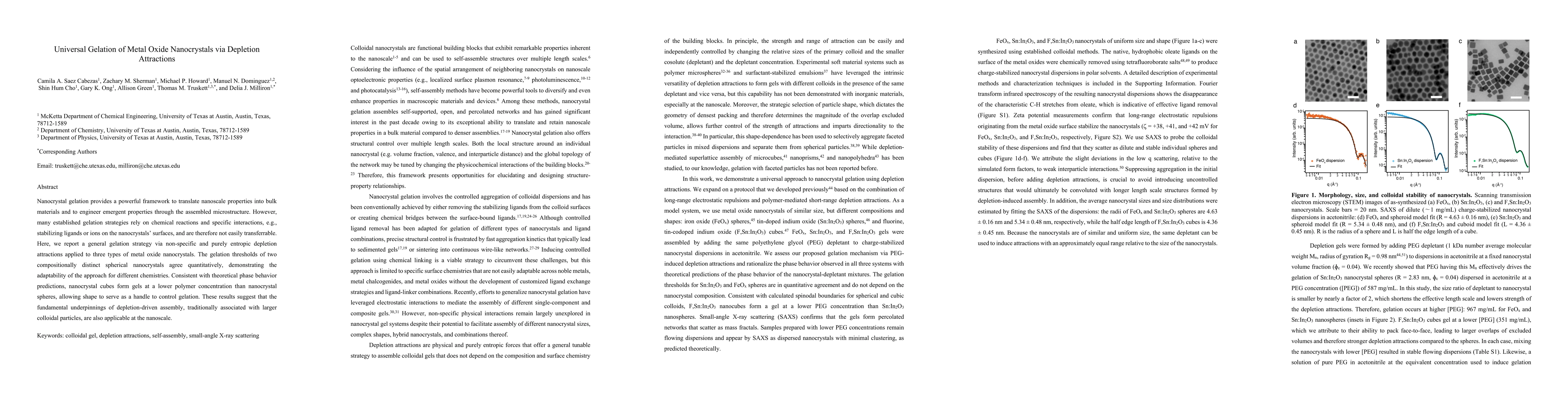 This paper presents a universal gelation method for metal oxide nanocrystals using non-specific depletion attractions, demonstrating its applicability across different chemistries and shapes. The study shows that nanocrystal cubes gel at lower polymer concentrations than spheres, indicating shape-dependent control over gelation.