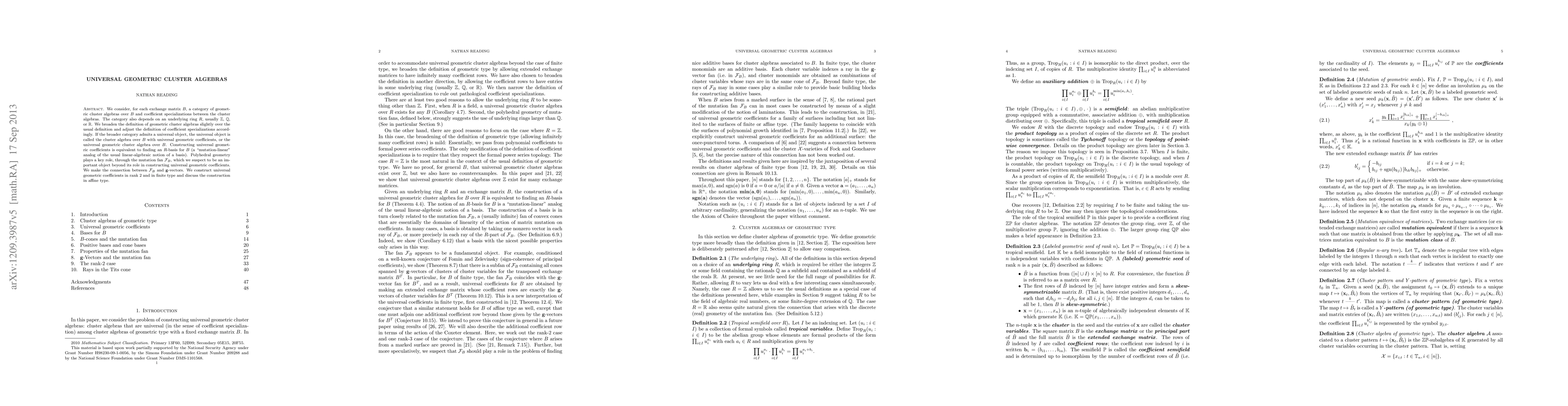 This paper investigates the category of geometric cluster algebras associated with an exchange matrix B, extending their definitions and exploring universal objects within this category. It introduces the concept of universal geometric cluster algebras and discusses the role of polyhedral geometry, specifically through the mutation fan F_B, in constructing these universal coefficients.