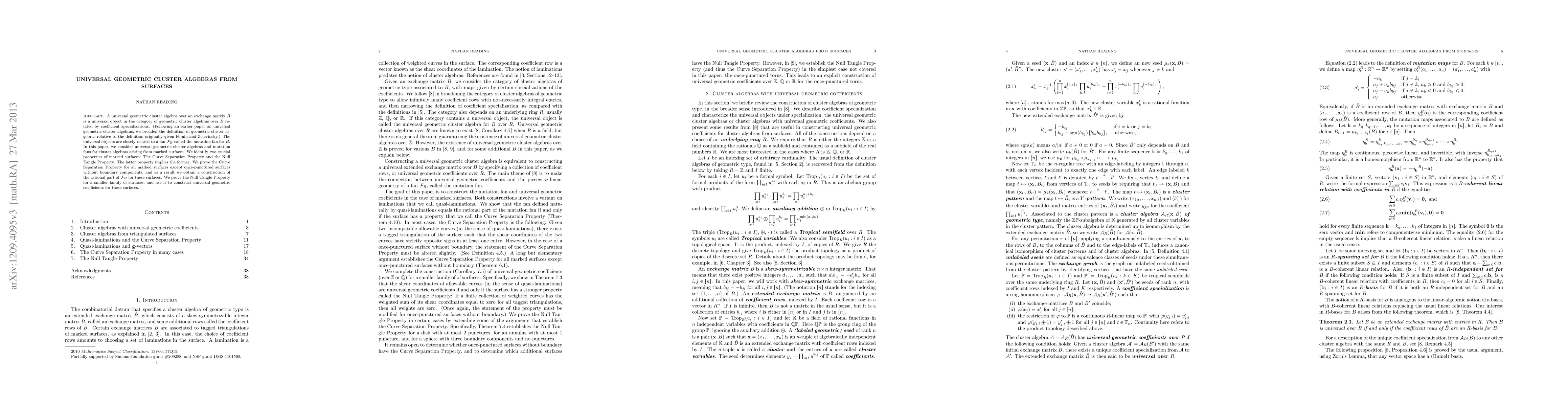 This paper explores universal geometric cluster algebras from marked surfaces, identifying two key properties: the Curve Separation Property and the Null Tangle Property. It proves the Curve Separation Property for most surfaces and constructs the rational part of the mutation fan for these cases, while proving the Null Tangle Property for a specific subset to develop universal geometric coefficients.
