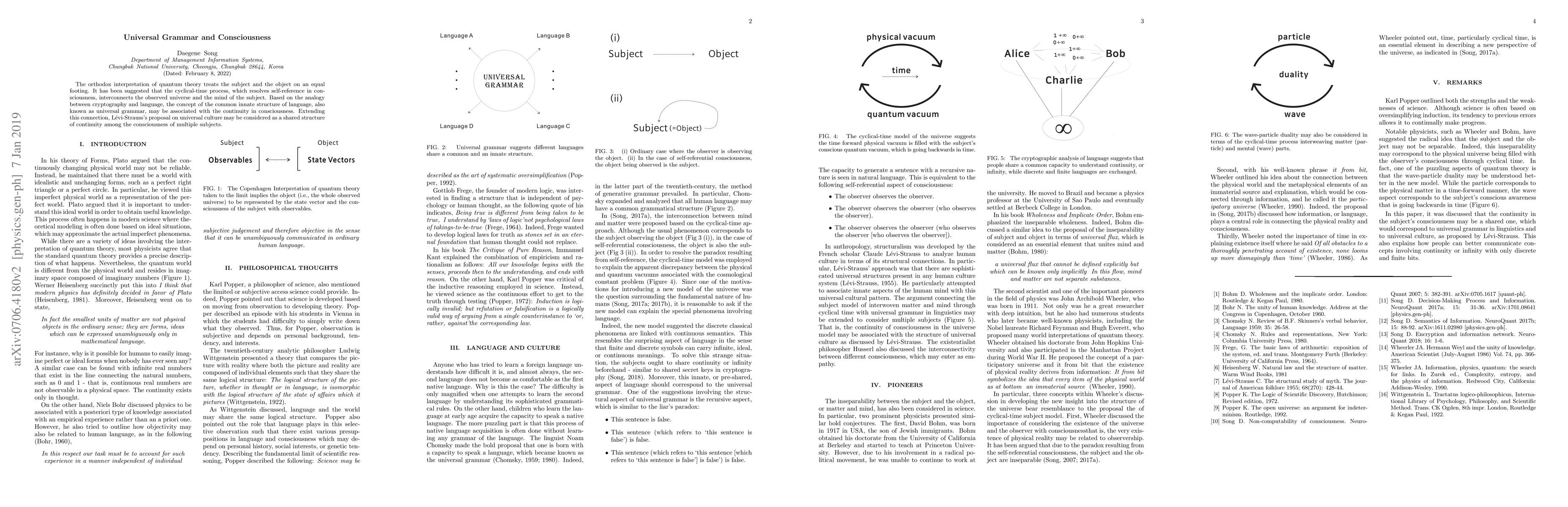 The orthodox interpretation of quantum theory treats the subject and the object on an equal footing. It has been suggested that the cyclical-time process, which resolves self-reference in consciousness, interconnects the observed universe and the mind of the subject. Based on the analogy between cryptography and language, the concept of the common innate structure of language, also known as universal grammar, may be associated with the continuity in consciousness. Extending this connection, Levi-Strauss's proposal on universal culture may be considered as a shared structure of continuity among the consciousness of multiple subjects.