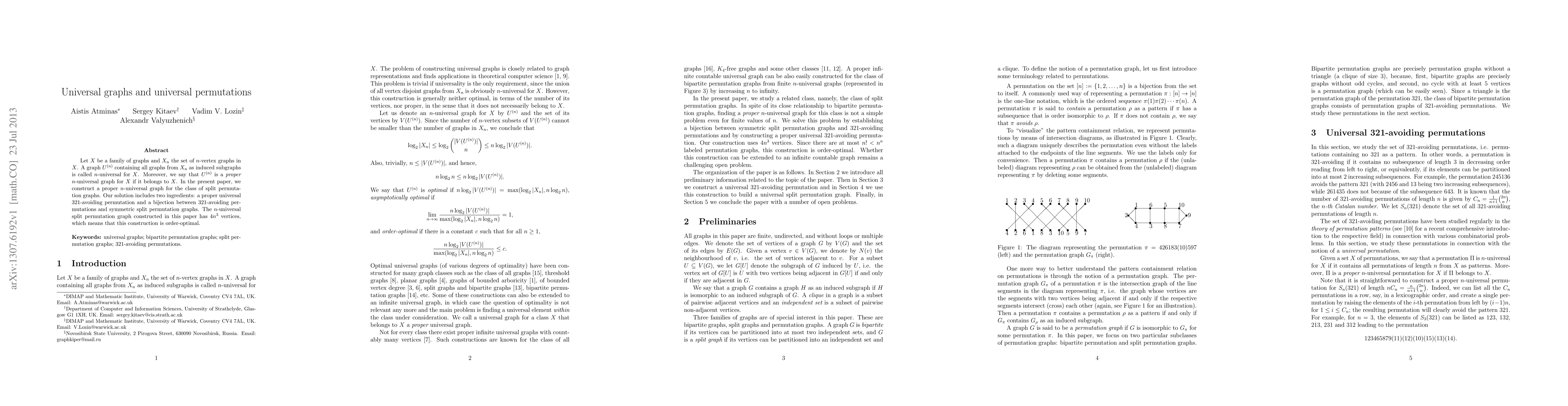 Let $X$ be a family of graphs and $X_n$ the set of $n$-vertex graphs in $X$. A graph $U^{(n)}$ containing all graphs from $X_n$ as induced subgraphs is called $n$-universal for $X$. Moreover, we say that $U^{(n)}$ is a proper $n$-universal graph for $X$ if it belongs to $X$. In the present paper, we construct a proper $n$-universal graph for the class of split permutation graphs. Our solution includes two ingredients: a proper universal 321-avoiding permutation and a bijection between 321-avoiding permutations and symmetric split permutation graphs. The $n$-universal split permutation graph constructed in this paper has $4n^3$ vertices, which means that this construction is order-optimal.
