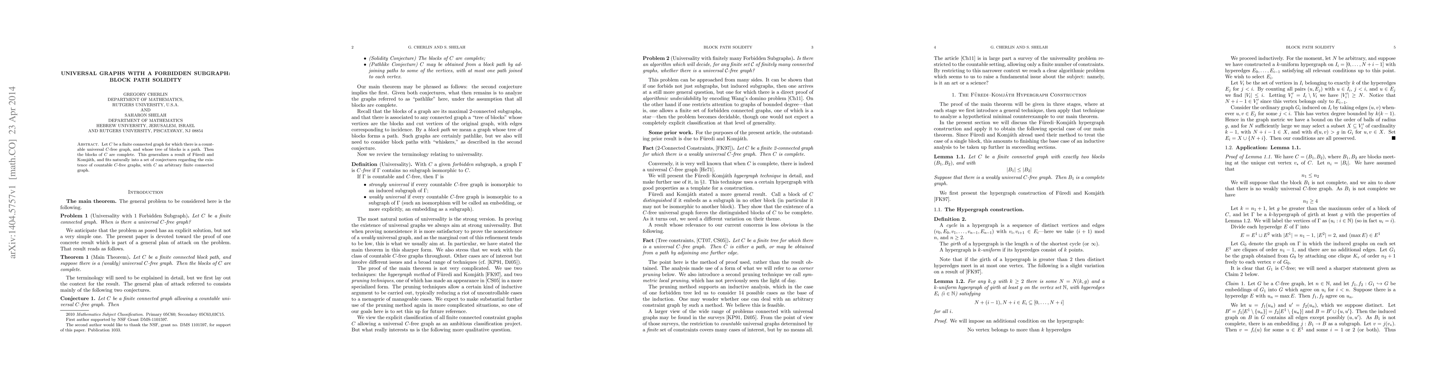Let C be a finite connected graph for which there is a countable universal C-free graph, and whose tree of blocks is a path. Then the blocks of C are complete. This generalizes a result of Furedi and Komjath, and fits naturally into a set of conjectures regarding the existence of countable C-free graphs, with C an arbitrary finite connected graph.