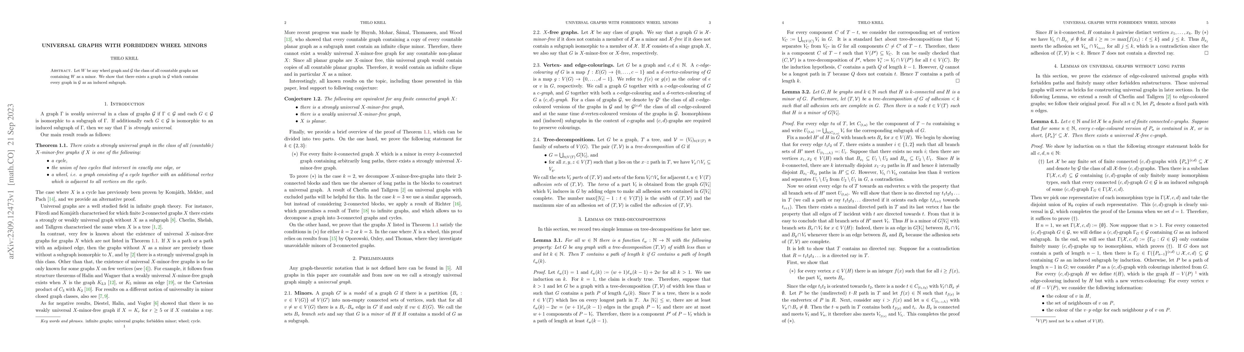Summary: This paper demonstrates the existence of a universal graph in the class $\mathcal{G}$ of countable graphs that do not contain a specific wheel graph $W$ as a minor, and this universal graph contains every other graph in $\mathcal{G}$ as an induced subgraph.