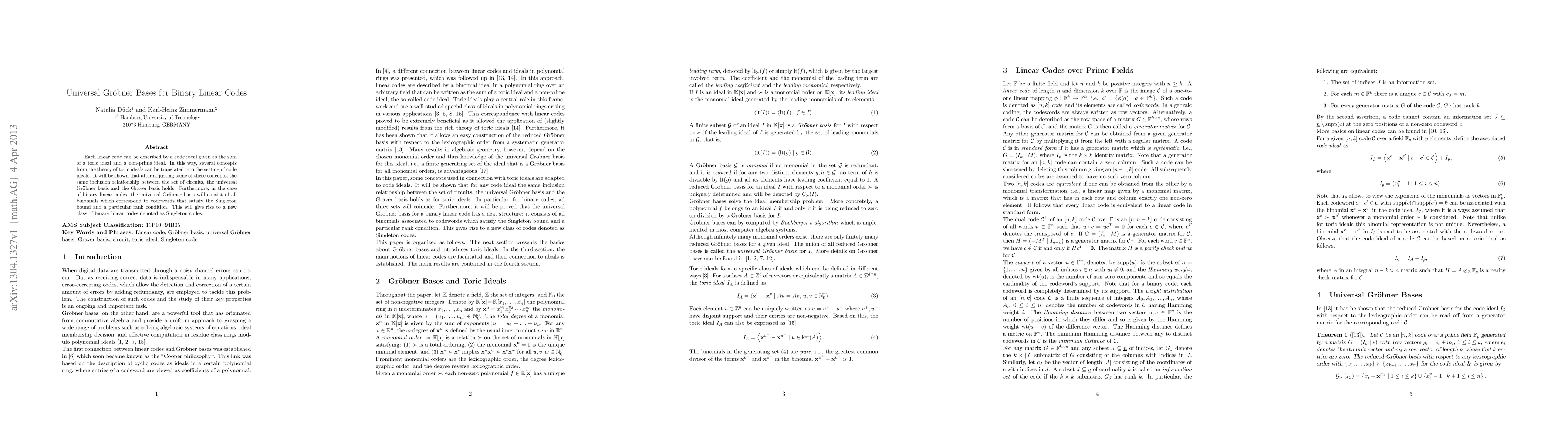 This paper explores the translation of toric ideal theory into the realm of code ideals for linear codes, demonstrating that the same inclusion relationship between circuits, universal Gröbner bases, and Graver bases applies. For binary linear codes, the universal Gröbner basis comprises binomials that meet the Singleton bound and a rank condition, leading to a new class of Singleton codes.