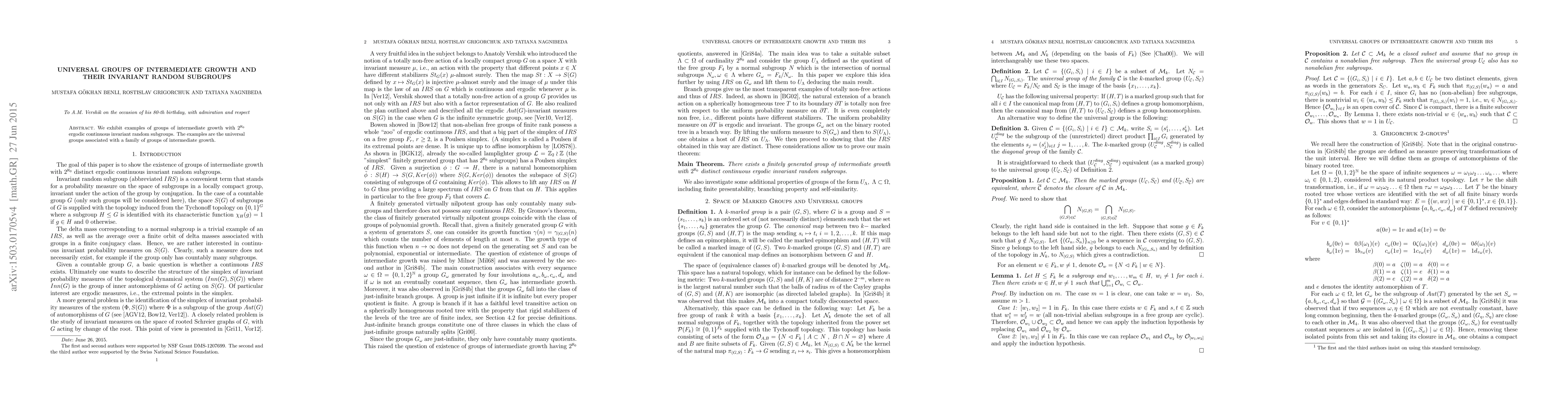 We exhibit examples of groups of intermediate growth with $2^{\aleph_0}$ ergodic, continuous, invariant random subgroups. The examples are the universal groups associated with a family of groups of intermediate growth.