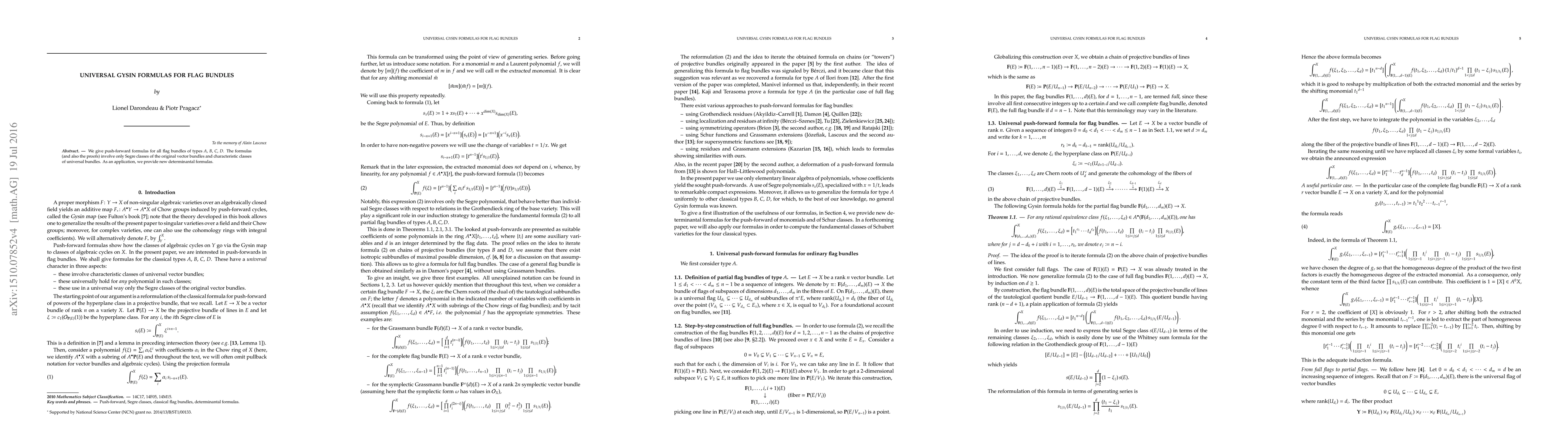 We give push-forward formulas for all flag bundles of types A, B, C, D. The formulas (and also the proofs) involve only Segre classes of the original vector bundles and characteristic classes of universal bundles. As an application, we provide new determinantal formulas.
