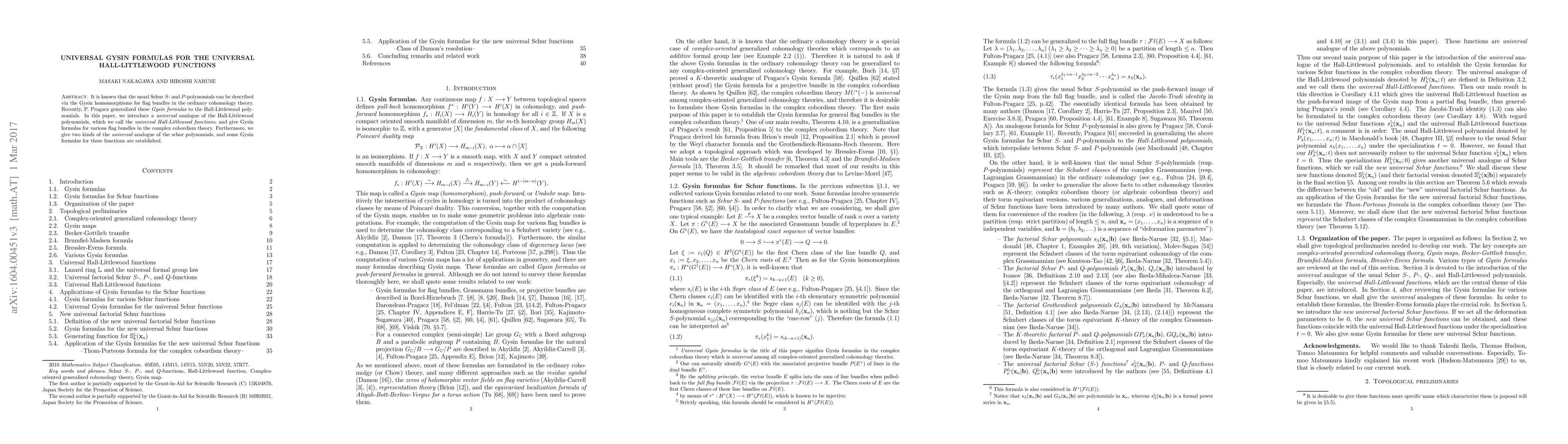It is known that the usual Schur $S$- and $P$-polynomials can be described via the Gysin homomorphisms for flag bundles in the ordinary cohomology theory. Recently, P. Pragacz generalized these Gysin formulas to the Hall-Littlewood polynomials. In this paper, we introduce a {\it universal} analogue of the Hall-Littlewood polynomials, which we call the {\it universal Hall-Littlewood functions}, and give Gysin formulas for various flag bundles in the complex cobordism theory. Furthermore, we give two kinds of the {\it universal} analogue of the schur polynomials, and some Gysin formulas for these functions are established.