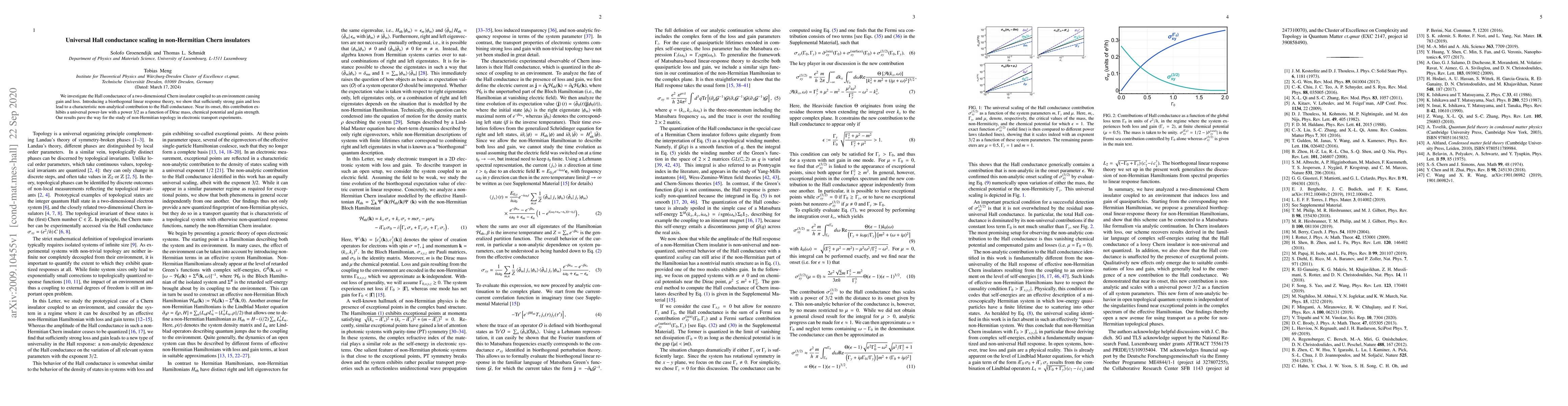 This study reveals a universal power-law scaling in the Hall conductance of non-Hermitian Chern insulators due to gain and loss environments, showing a 3/2 scaling near the onset of this effect. This finding opens new avenues for exploring non-Hermitian topological phases in electronic transport.