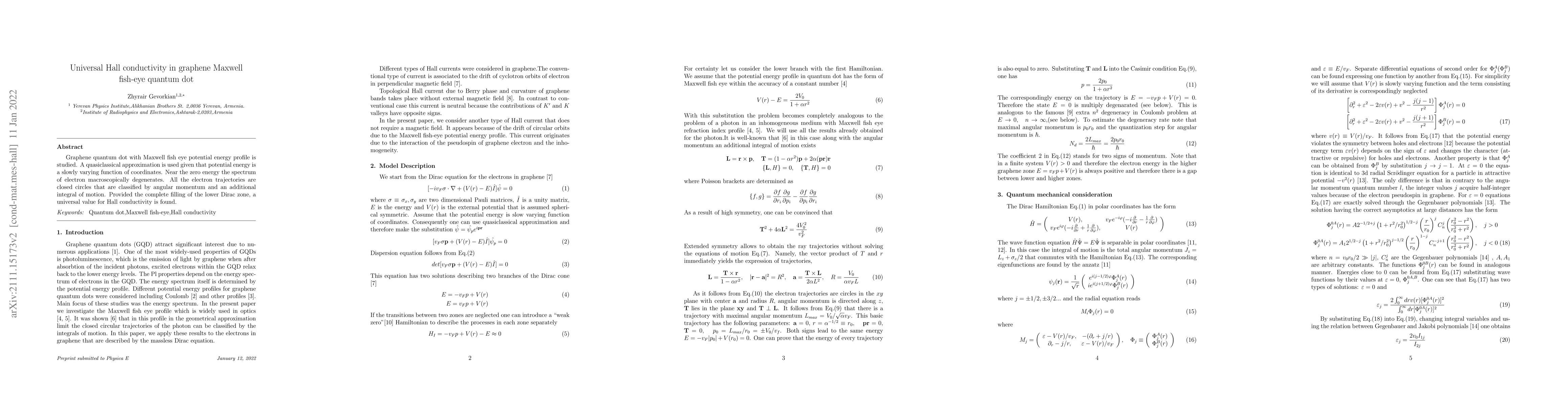 This paper investigates a graphene quantum dot with a Maxwell fish-eye potential, revealing a universal Hall conductivity when the lower Dirac zone is fully filled. The study employs quasiclassical approximation due to the slowly varying potential, showing electron trajectories forming closed circles.