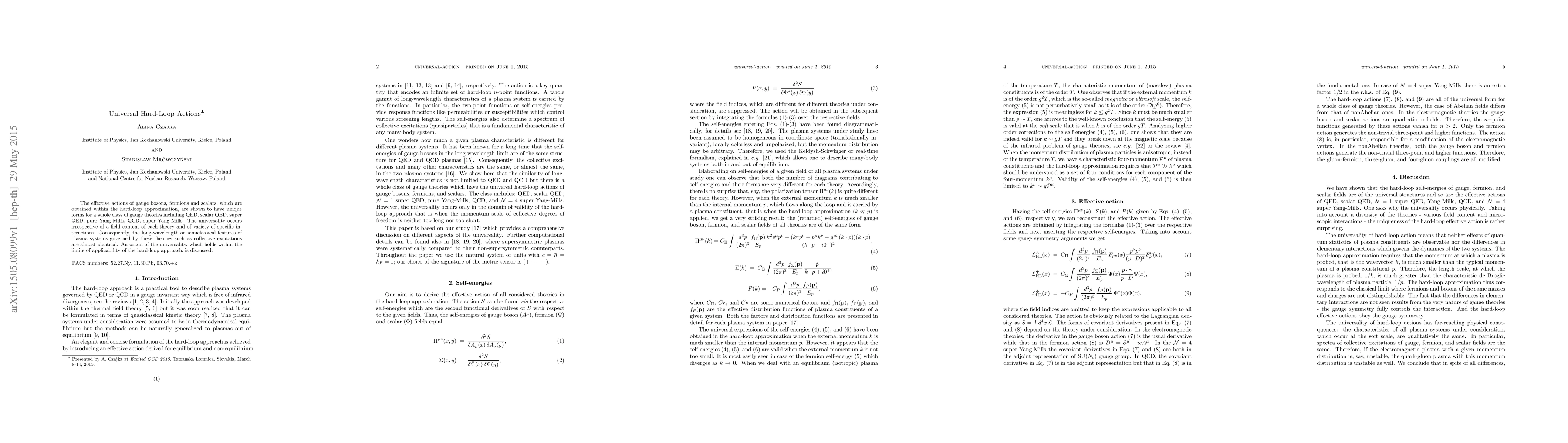 This paper demonstrates that the effective actions of gauge bosons, fermions, and scalars, derived via the hard-loop approximation, exhibit universal forms across a broad range of gauge theories including QED, QCD, and their supersymmetric variants. The universality implies similar long-wavelength features in plasma systems governed by these theories, despite differences in field content and interactions.