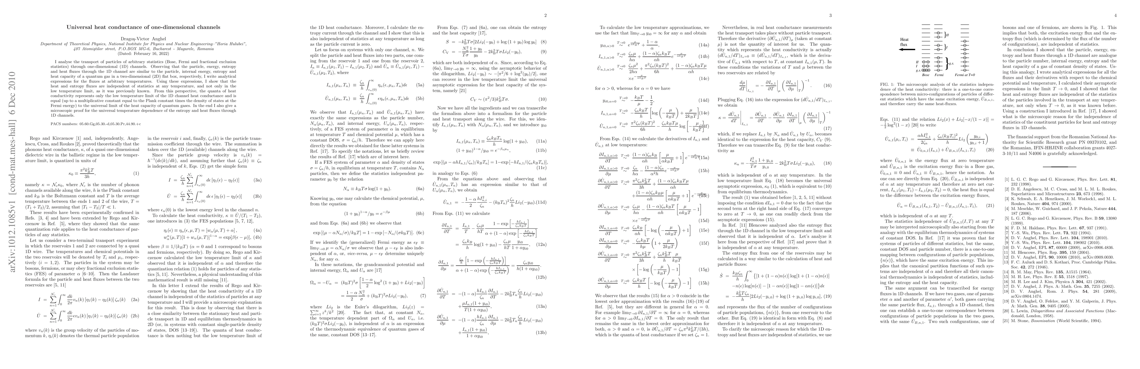 This paper analyzes the transport of particles through one-dimensional channels, demonstrating that heat and entropy fluxes are independent of particle statistics at all temperatures, not just at low temperatures. It reveals a universal heat conductance limit equivalent to the heat capacity of quantum gases.