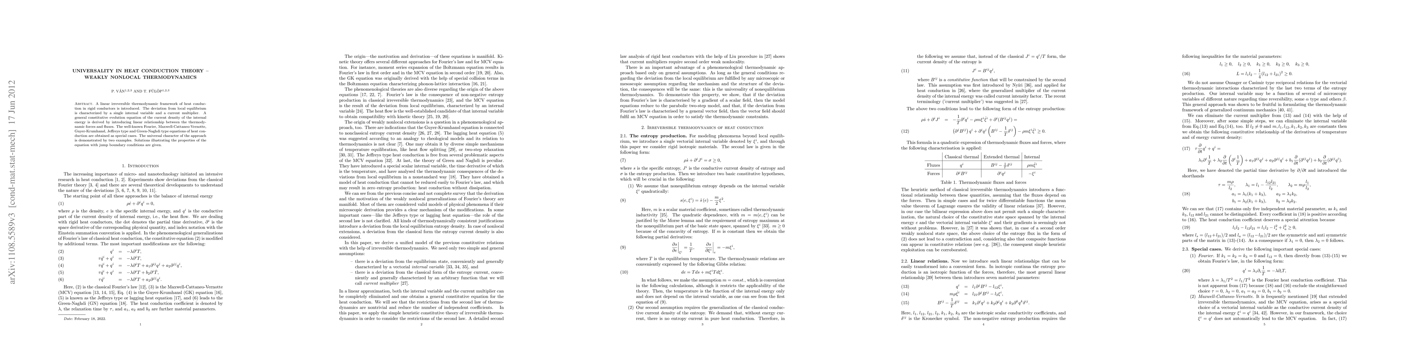 This paper introduces a linear irreversible thermodynamic framework for heat conduction in rigid conductors, deriving a general constitutive evolution equation for internal energy current density. It demonstrates the universal applicability of the approach by deriving various known heat conduction models as special cases and providing solutions with jump boundary conditions.
