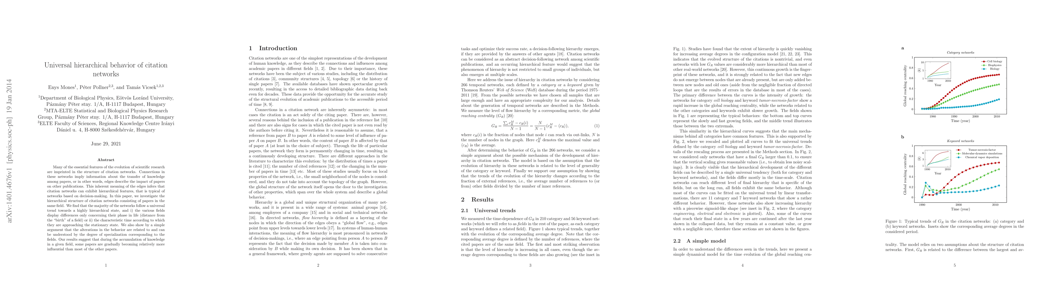 Many of the essential features of the evolution of scientific research are imprinted in the structure of citation networks. Connections in these networks imply information about the transfer of knowledge among papers, or in other words, edges describe the impact of papers on other publications. This inherent meaning of the edges infers that citation networks can exhibit hierarchical features, that is typical of networks based on decision-making. In this paper, we investigate the hierarchical structure of citation networks consisting of papers in the same field. We find that the majority of the networks follow a universal trend towards a highly hierarchical state, and i) the various fields display differences only concerning their phase in life (distance from the "birth" of a field) or ii) the characteristic time according to which they are approaching the stationary state. We also show by a simple argument that the alterations in the behavior are related to and can be understood by the degree of specialization corresponding to the fields. Our results suggest that during the accumulation of knowledge in a given field, some papers are gradually becoming relatively more influential than most of the other papers.