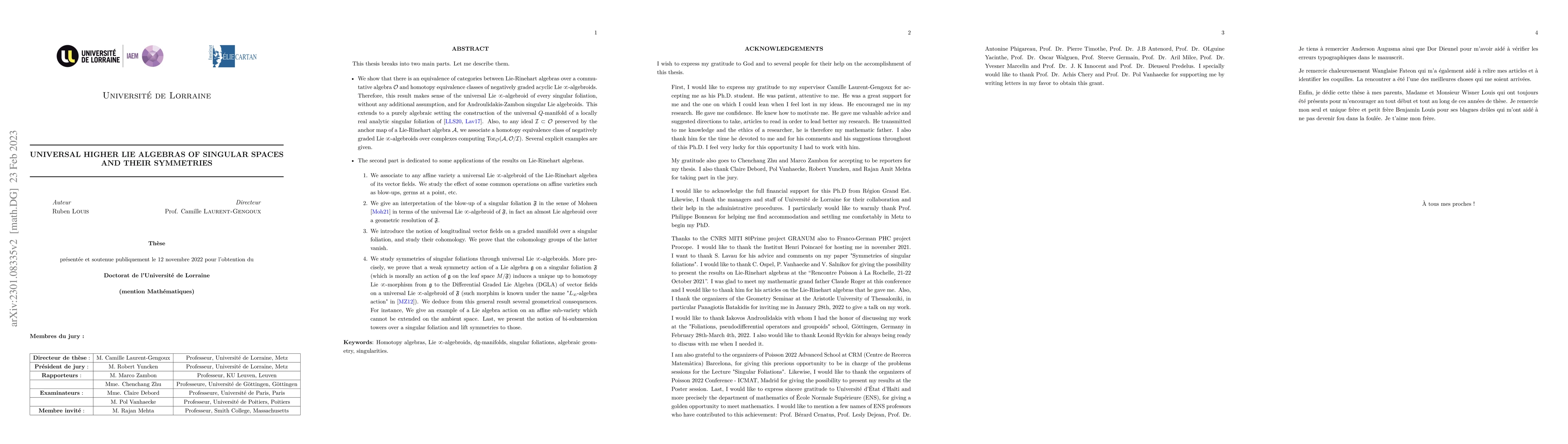 The results of this manuscript is the collection of my articles that I published during my PhD thesis. We show that there is an equivalence of categories between Lie-Rinehart algebras over a commutative algebra $\mathcal O$ and homotopy equivalence classes of negatively graded acyclic Lie $\infty$-algebroids. Therefore, this result makes sense of the universal Lie $\infty$-algebroid of every singular foliation, without any additional assumption, and for Androulidakis-Zambon singular Lie algebroids. This extends to a purely algebraic setting the construction of the universal $Q$-manifold of a locally real analytic singular foliation of Lavau-C.L.-Strobl. Then we apply these results to study symmetries of singular foliations through universal Lie $\infty$-algebroids. More precisely, we prove that a weak symmetry action of a Lie algebra $\mathfrak{g}$ on a singular foliation $\mathfrak F$ (which is morally an action of $\mathfrak g$ on the leaf space $M/\mathfrak F$) induces a unique up to homotopy Lie $\infty$-morphism from $\mathfrak{g}$ to the Differential Graded Lie Algebra (DGLA) of vector fields on a universal Lie $\infty$-algebroid of $\mathfrak F$ (such morphim is known under the name "$L_\infty$-algebra action" in Mehta-Zambon. We deduce from this general result several geometrical consequences. For instance, We give an example of a Lie algebra action on an affine sub-variety which cannot be extended on the ambient space. Last, we present the notion of bi-submersion towers over a singular foliation and lift symmetries to those. \end{enumerate} \end{itemize}