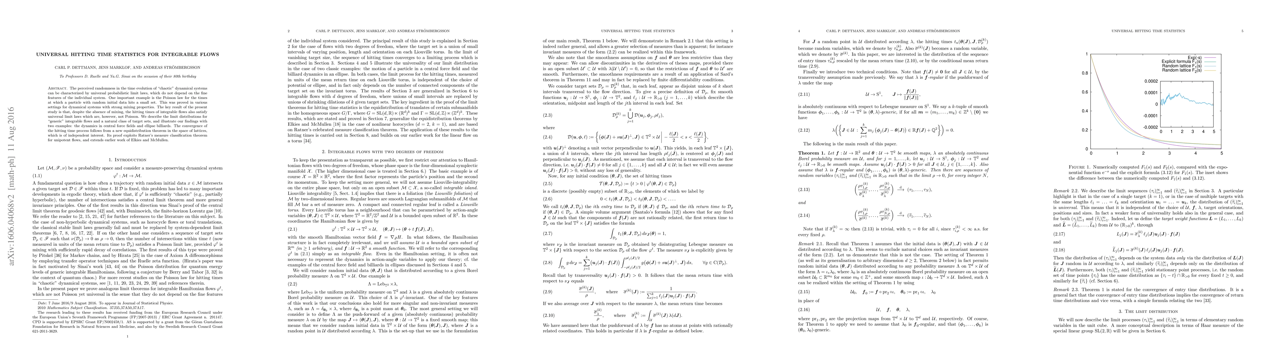 The perceived randomness in the time evolution of "chaotic" dynamical systems can be characterized by universal probabilistic limit laws, which do not depend on the fine features of the individual system. One important example is the Poisson law for the times at which a particle with random initial data hits a small set. This was proved in various settings for dynamical systems with strong mixing properties. The key result of the present study is that, despite the absence of mixing, the hitting times of integrable flows also satisfy universal limit laws which are, however, not Poisson. We describe the limit distributions for "generic" integrable flows and a natural class of target sets, and illustrate our findings with two examples: the dynamics in central force fields and ellipse billiards. The convergence of the hitting time process follows from a new equidistribution theorem in the space of lattices, which is of independent interest. Its proof exploits Ratner's measure classification theorem for unipotent flows, and extends earlier work of Elkies and McMullen.