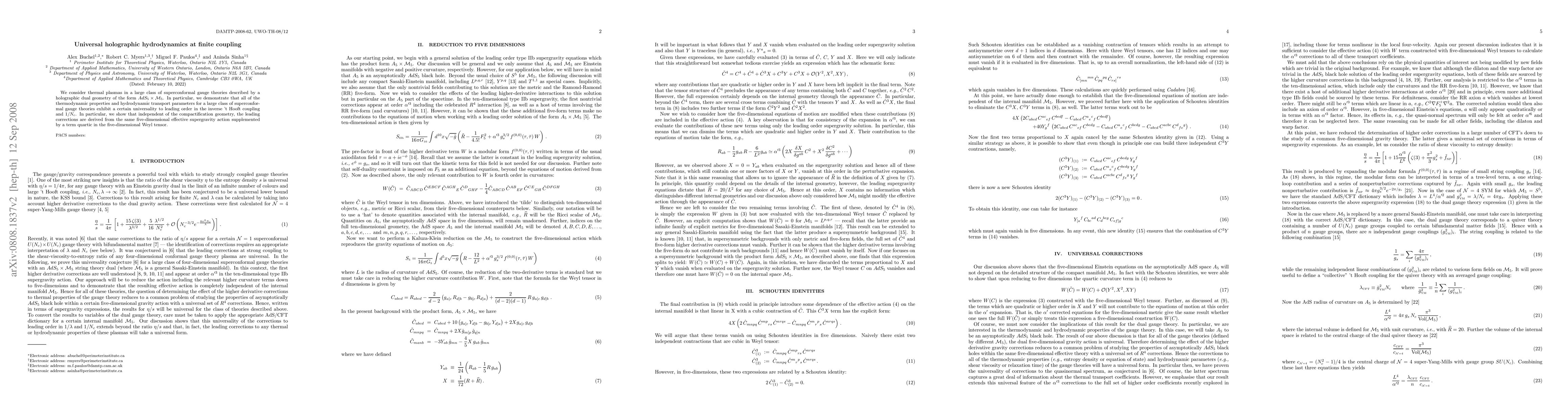 This paper explores universal holographic hydrodynamics in thermal plasmas of superconformal gauge theories, revealing that thermodynamic properties and transport parameters exhibit universality at leading order in inverse 't Hooft coupling and $1/N_c$, regardless of the compactification geometry. The leading corrections are derived from a five-dimensional effective supergravity action with a quartic Weyl tensor term.
