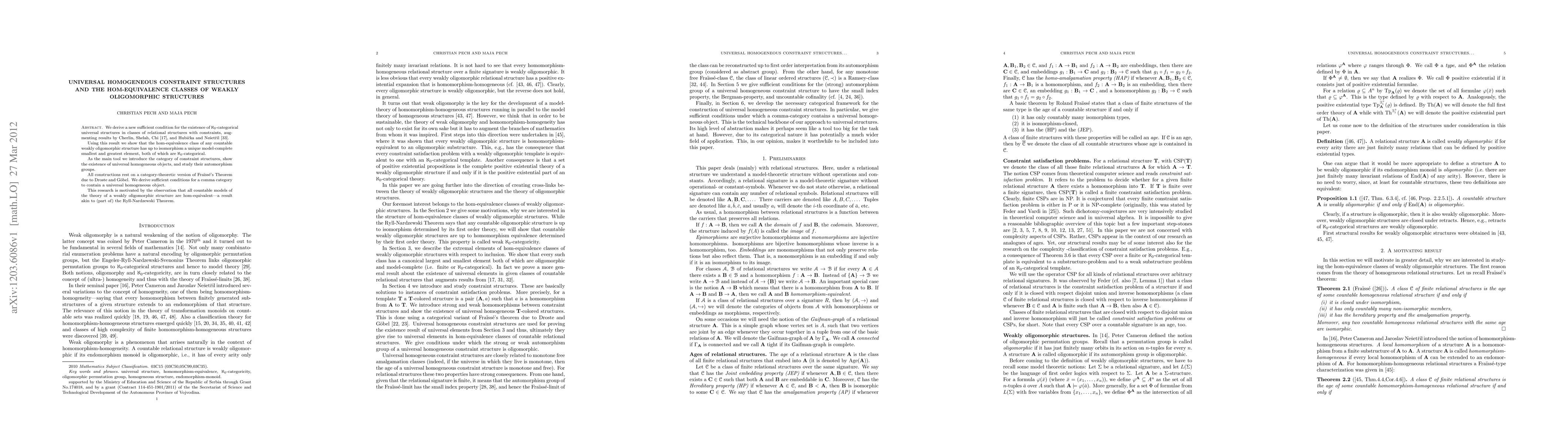 We derive a new sufficient condition for the existence of {\omega}-categorical universal structures in classes of relational structures with constraints, augmenting results by Cherlin, Shelah, Chi, and Hubi\v{c}ka and Ne\v{s}et\v{r}il. Using this result we show that the hom-equivalence class of any countable weakly oligomorphic structure has up to isomorphism a unique model-complete smallest and greatest element, both of which are {\omega}-categorical. As the main tool we introduce the category of constraint structures, show the existence of universal homogeneous objects, and study their automorphism groups. All constructions rest on a category-theoretic version of Fra\"iss\'e's Theorem due to Droste and G\"obel. We derive sufficient conditions for a comma category to contain a universal homogeneous object. This research is motivated by the observation that all countable models of the theory of a weakly oligomorphic structure are hom-equivalent---a result akin to (part of) the Ryll-Nardzewski Theorem.