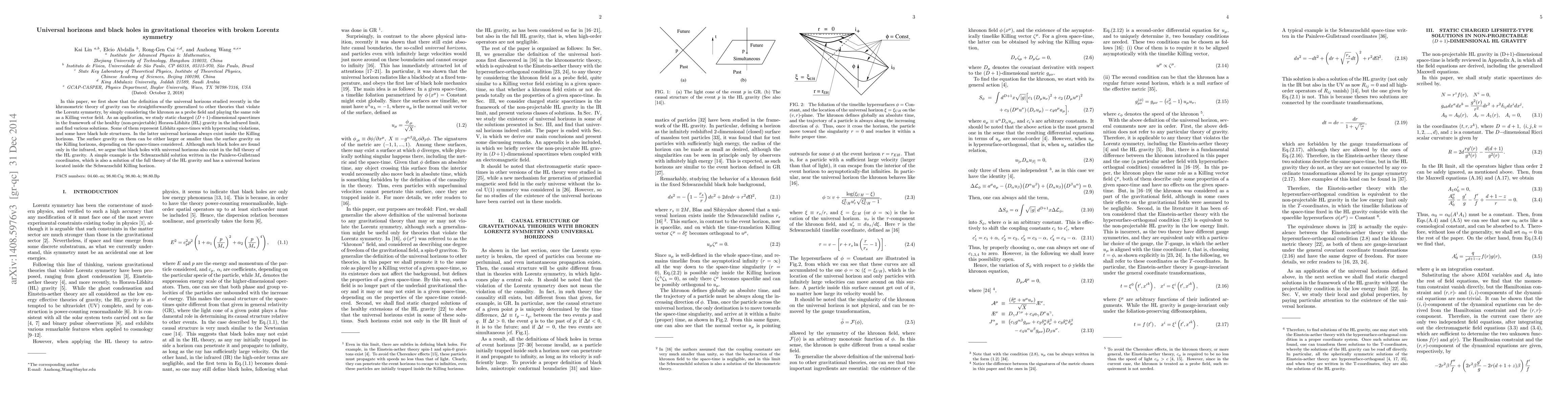In this paper, we first show that the definition of the universal horizons studied recently in the khrononmetric theory of gravity can be straightforwardly generalized to other theories that violate the Lorentz symmetry, by simply considering the khronon as a probe field and playing the same role as a Killing vector field. As an application, we study static charged ($D+1$)-dimensional spacetimes in the framework of the healthy (non-projectable) Horava-Lifshitz (HL) gravity in the infrared limit, and find various solutions. Some of them represent Lifshitz space-times with hyperscaling violations, and some have black hole structures. In the latter universal horizons always exist inside the Killing horizons. The surface gravity on them can be either larger or smaller than the surface gravity on the Killing horizons, depending on the space-times considered. Although such black holes are found only in the infrared, we argue that black holes with universal horizons also exist in the full theory of the HL gravity. A simple example is the Schwarzschild solution written in the Painleve-Gullstrand coordinates, which is also a solution of the full theory of the HL gravity and has a universal horizon located inside the Schwarzschild Killing horizon.