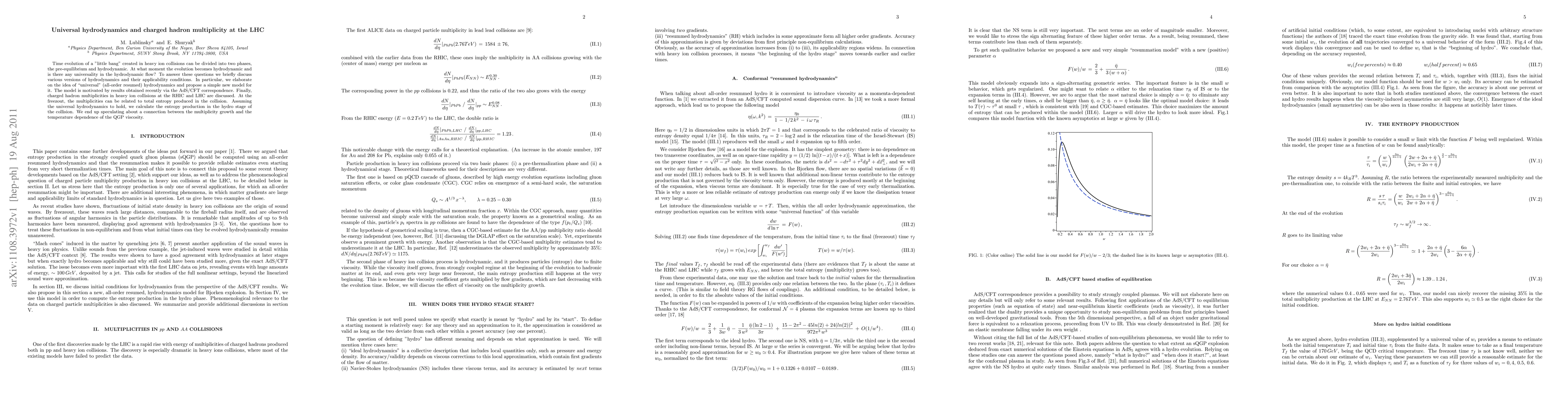 Time evolution of a "little bang" created in heavy ion collisions can be divided into two phases, the pre-equilibrium and hydrodynamic. At what moment the evolution becomes hydrodynamic and is there any universality in the hydrodynamic flow? To answer these questions we briefly discuss various versions of hydrodynamics and their applicability conditions. In particular, we elaborate on the idea of "universal" (all-order resumed) hydrodynamics and propose a simple new model for it. The model is motivated by results obtained recently via the AdS/CFT correspondence. Finally, charged hadron multiplicities in heavy ion collisions at the RHIC and LHC are discussed. At the freezout, the multiplicities can be related to total entropy produced in the collision. Assuming the universal hydrodynamics to hold, we calculate the entropy production in the hydro stage of the collision. We end up speculating about a connection between the multiplicity growth and the temperature dependence of the QGP viscosity.