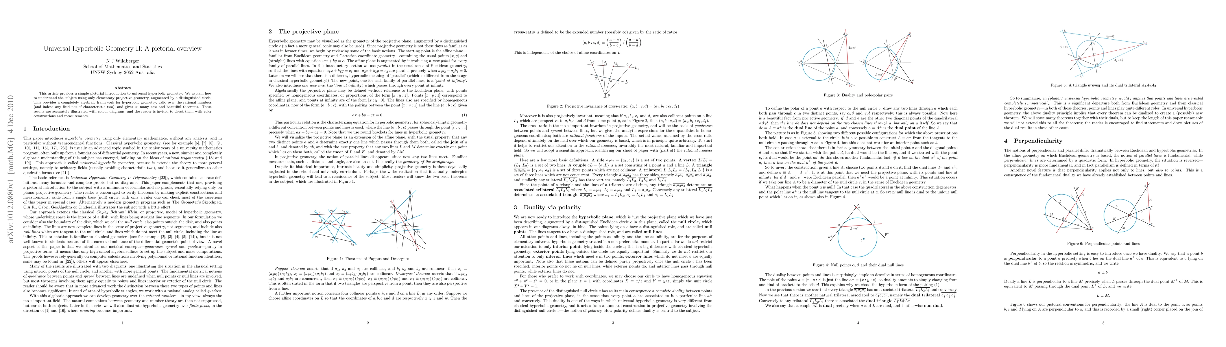 This article provides a simple pictorial introduction to universal hyperbolic geometry. We explain how to understand the subject using only elementary projective geometry, augmented by a distinguished circle. This provides a completely algebraic framework for hyperbolic geometry, valid over the rational numbers (and indeed any field not of characteristic two), and gives us many new and beautiful theorems. These results are accurately illustrated with colour diagrams, and the reader is invited to check them with ruler constructions and measurements.