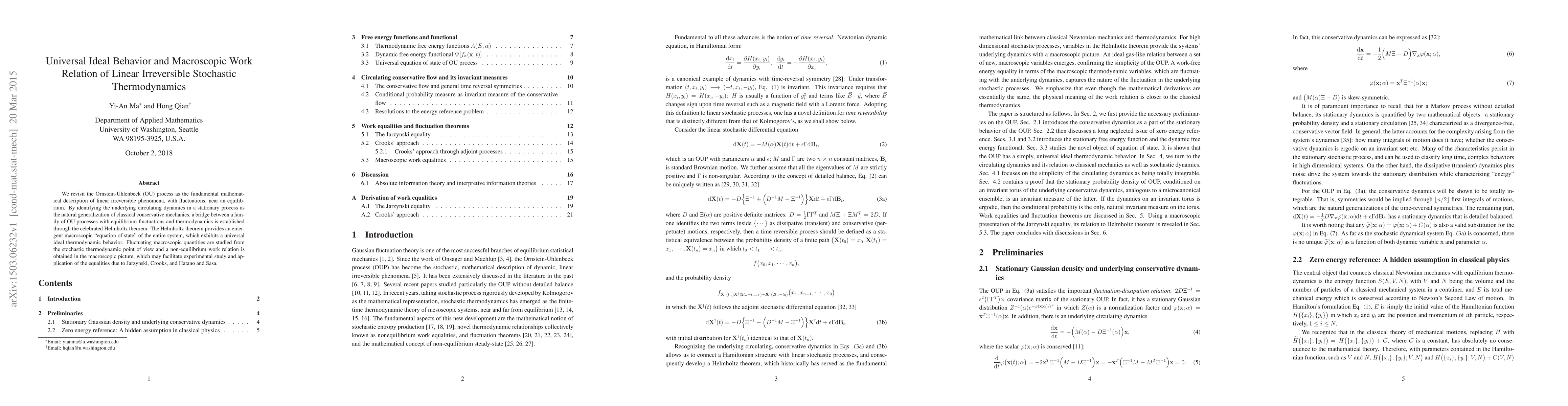 We revisit the Ornstein-Uhlenbeck (OU) process as the fundamental mathematical description of linear irreversible phenomena, with fluctuations, near an equilibrium. By identifying the underlying circulating dynamics in a stationary process as the natural generalization of classical conservative mechanics, a bridge between a family of OU processes with equilibrium fluctuations and thermodynamics is established through the celebrated Helmholtz theorem. The Helmholtz theorem provides an emergent macroscopic "equation of state" of the entire system, which exhibits a universal ideal thermodynamic behavior. Fluctuating macroscopic quantities are studied from the stochastic thermodynamic point of view and a non-equilibrium work relation is obtained in the macroscopic picture, which may facilitate experimental study and application of the equalities due to Jarzynski, Crooks, and Hatano and Sasa.