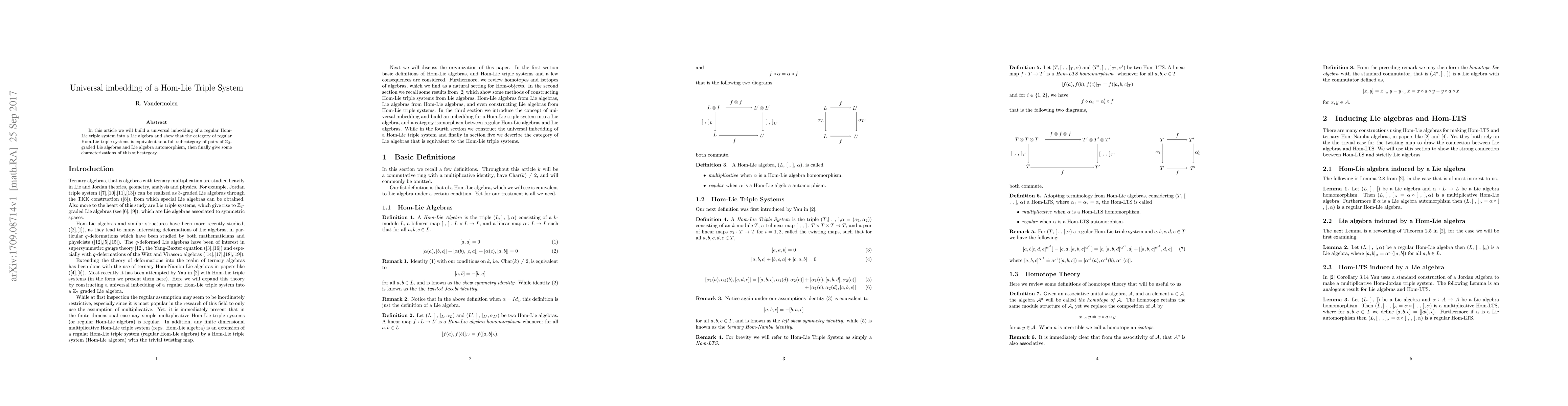 The paper constructs a universal embedding of a regular Hom-Lie triple system into a Lie algebra, establishing an equivalence between the category of regular Hom-Lie triple systems and a specific subcategory of $\mathbb{Z}/2\mathbb{Z}$-graded Lie algebras and their automorphisms. It also provides characterizations of this subcategory.