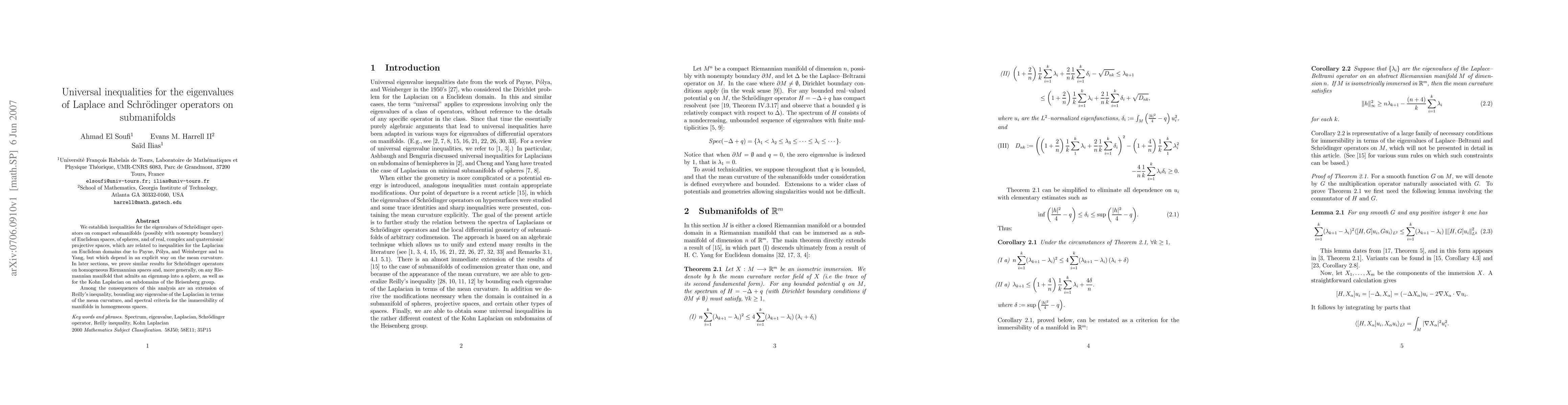This paper establishes universal inequalities for the eigenvalues of Schrödinger and Laplacian operators on various submanifolds, explicitly relating them to mean curvature and extending results from Euclidean domains to more complex spaces. It also extends Reilly's inequality and provides spectral criteria for manifold immersibility.