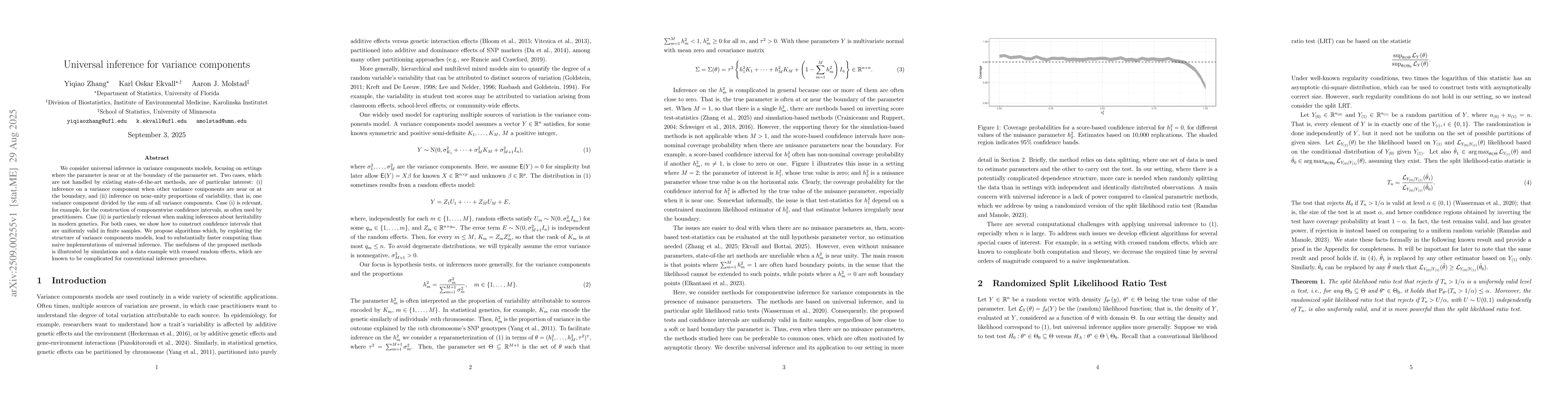 We consider universal inference in variance components models, focusing on settings where the parameter is near or at the boundary of the parameter set. Two cases, which are not handled by existing state-of-the-art methods, are of particular interest: (i) inference on a variance component when other variance components are near or at the boundary, and (ii) inference on near-unity proportions of variability, that is, one variance component divided by the sum of all variance components. Case (i) is relevant, for example, for the construction of componentwise confidence intervals, as often used by practitioners. Case (ii) is particularly relevant when making inferences about heritability in modern genetics. For both cases, we show how to construct confidence intervals that are uniformly valid in finite samples. We propose algorithms which, by exploiting the structure of variance components models, lead to substantially faster computing than naive implementations of universal inference. The usefulness of the proposed methods is illustrated by simulations and a data example with crossed random effects, which are known to be complicated for conventional inference procedures.