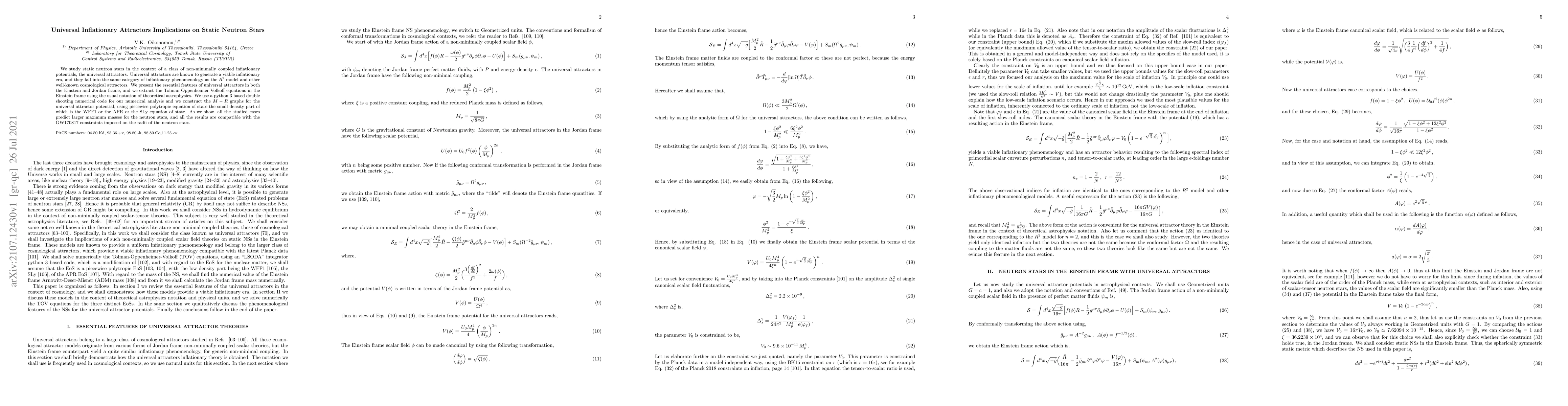We study static neutron stars in the context of a class of non-minimally coupled inflationary potentials, the universal attractors. Universal attractors are known to generate a viable inflationary era, and they fall into the same category of inflationary phenomenology as the $R^2$ model and other well-known cosmological attractors. We present the essential features of universal attractors in both the Einstein and Jordan frame, and we extract the Tolman-Oppenheimer-Volkoff equations in the Einstein frame using the usual notation of theoretical astrophysics. We use a python 3 based double shooting numerical code for our numerical analysis and we construct the $M-R$ graphs for the universal attractor potential, using piecewise polytropic equation of state the small density part of which is the WFF1 or the APR or the SLy equation of state. As we show, all the studied cases predict larger maximum masses for the neutron stars, and all the results are compatible with the GW170817 constraints imposed on the radii of the neutron stars.