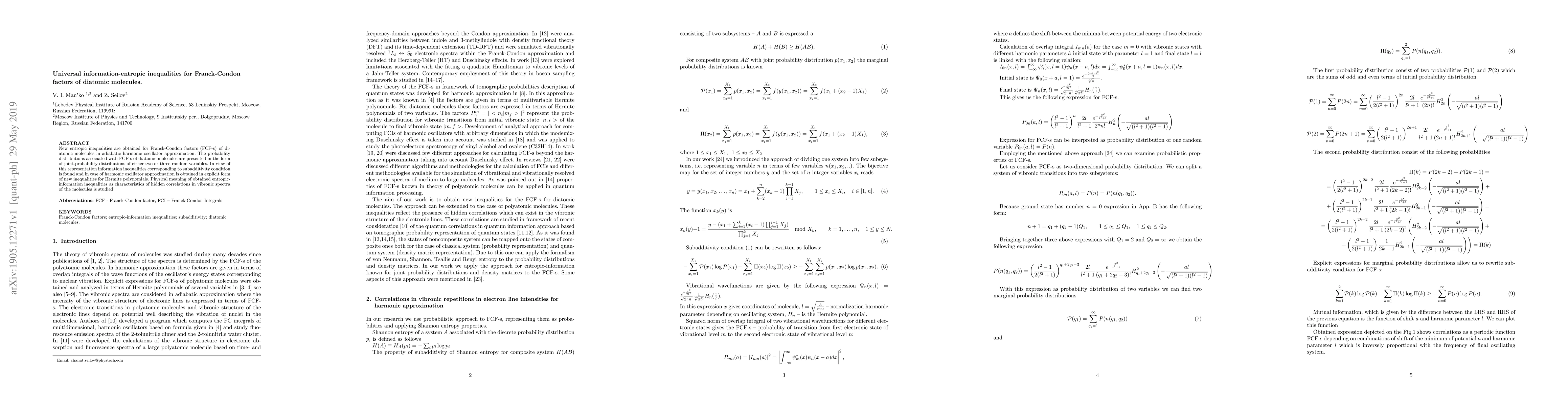 New entropic inequalities are obtained for Franck-Condon factors (FCF-s) of diatomic molecules in adiabatic harmonic oscillator approximation. The probability distributions associated with FCF-s of diatomic molecules are presented in the form of joint-probability distributions of either two or three random variables. In view of this representation information inequalities corresponding to subadditivity condition is found and in case of harmonic oscillator approximation is obtained in explicit form of new inequalities for Hermite polynomials. Physical meaning of obtained entropic-information inequalities as characteristics of hidden correlations in vibronic spectra of the molecules is studied.