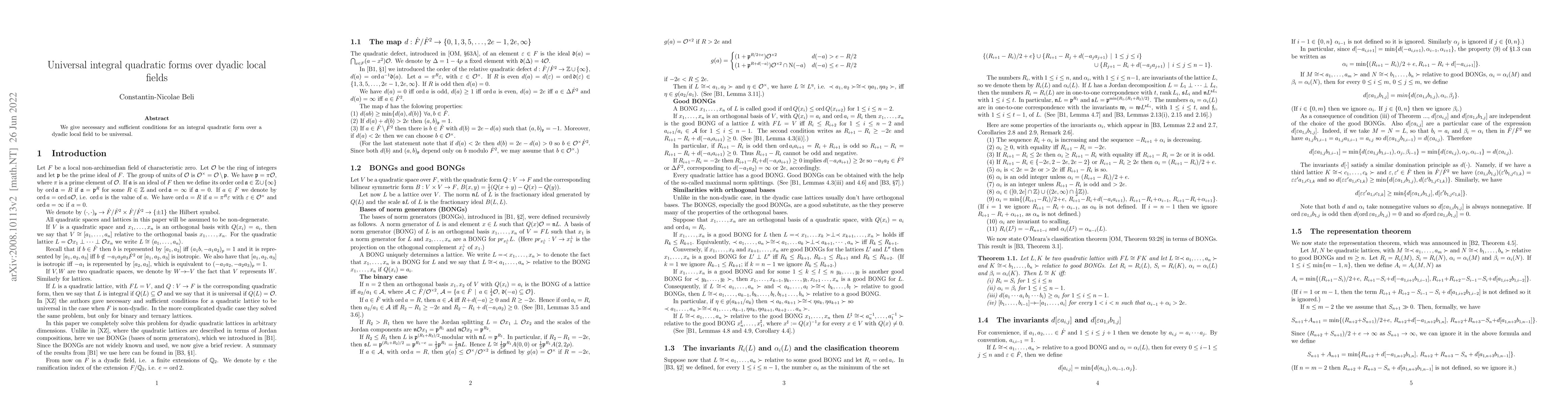 This paper determines all universal integral quadratic forms over dyadic local fields, extending previous results for non-dyadic fields. It provides a comprehensive solution in terms of BONGs and translates the findings into traditional Jordan splittings, while also discussing $n$-universality and necessary conditions for odd ranks.