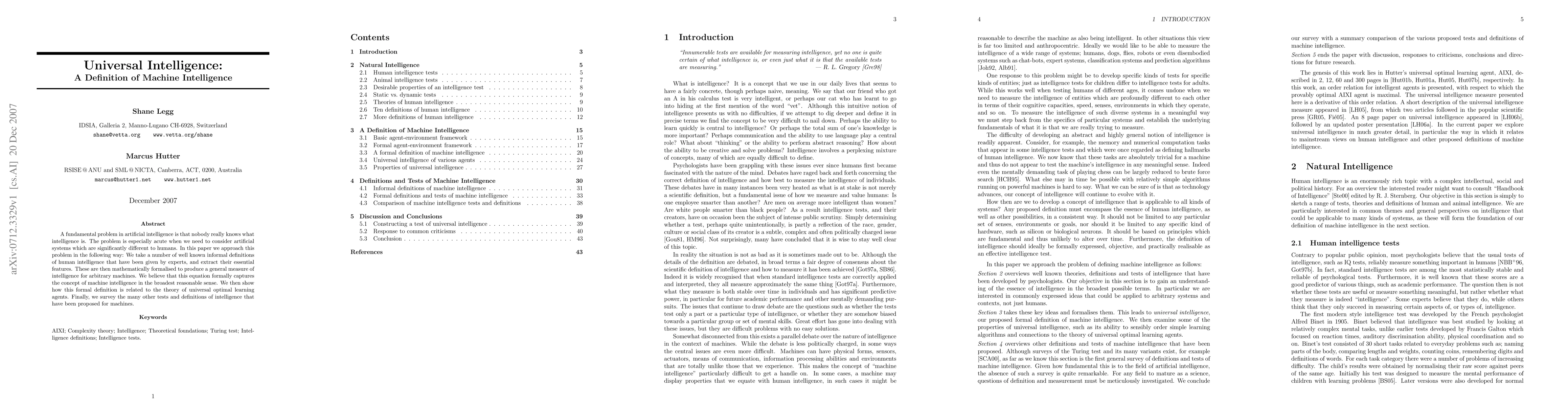 A fundamental problem in artificial intelligence is that nobody really knows what intelligence is. The problem is especially acute when we need to consider artificial systems which are significantly different to humans. In this paper we approach this problem in the following way: We take a number of well known informal definitions of human intelligence that have been given by experts, and extract their essential features. These are then mathematically formalised to produce a general measure of intelligence for arbitrary machines. We believe that this equation formally captures the concept of machine intelligence in the broadest reasonable sense. We then show how this formal definition is related to the theory of universal optimal learning agents. Finally, we survey the many other tests and definitions of intelligence that have been proposed for machines.