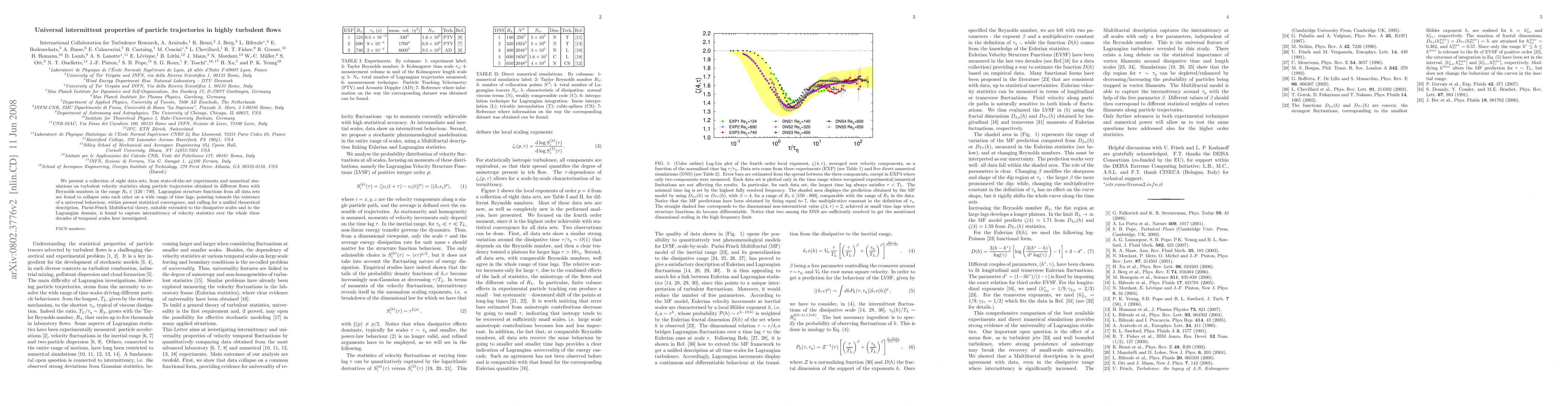 This paper demonstrates that particle trajectories in turbulent flows exhibit universal intermittent properties across various Reynolds numbers, as evidenced by the collapse of Lagrangian structure functions from multiple data sets. The Parisi-Frisch Multifractal theory, extended to the Lagrangian domain, effectively captures the intermittency observed.