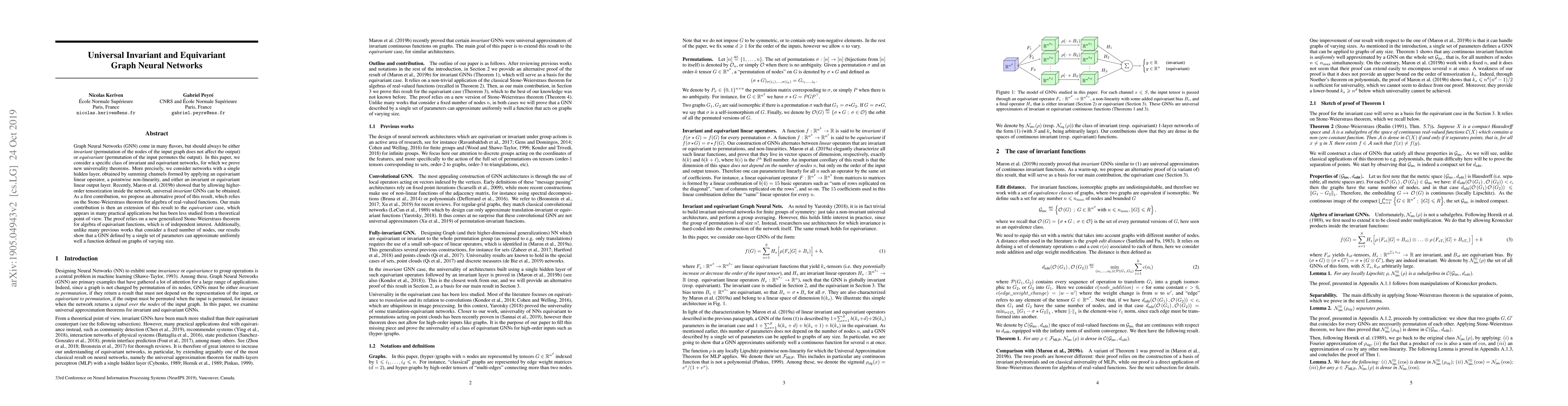 This paper proves new universality theorems for invariant and equivariant Graph Neural Networks (GNNs) with a single hidden layer. It provides an alternative proof for universal invariant GNNs using the Stone-Weierstrass theorem and extends this to the equivariant case with a new generalized Stone-Weierstrass theorem, demonstrating that a GNN can uniformly approximate functions on graphs of varying sizes.