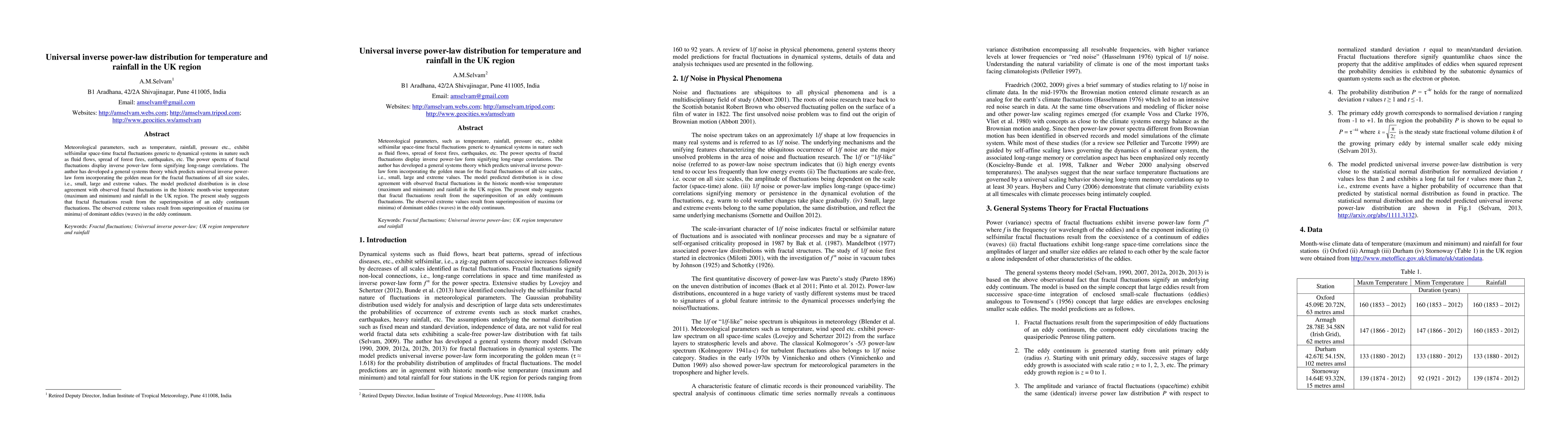 This paper proposes a universal inverse power-law distribution model for meteorological parameters like temperature and rainfall in the UK, based on fractal fluctuations. The model predicts long-range correlations and aligns closely with observed data, suggesting that extreme values arise from dominant eddy superpositions.