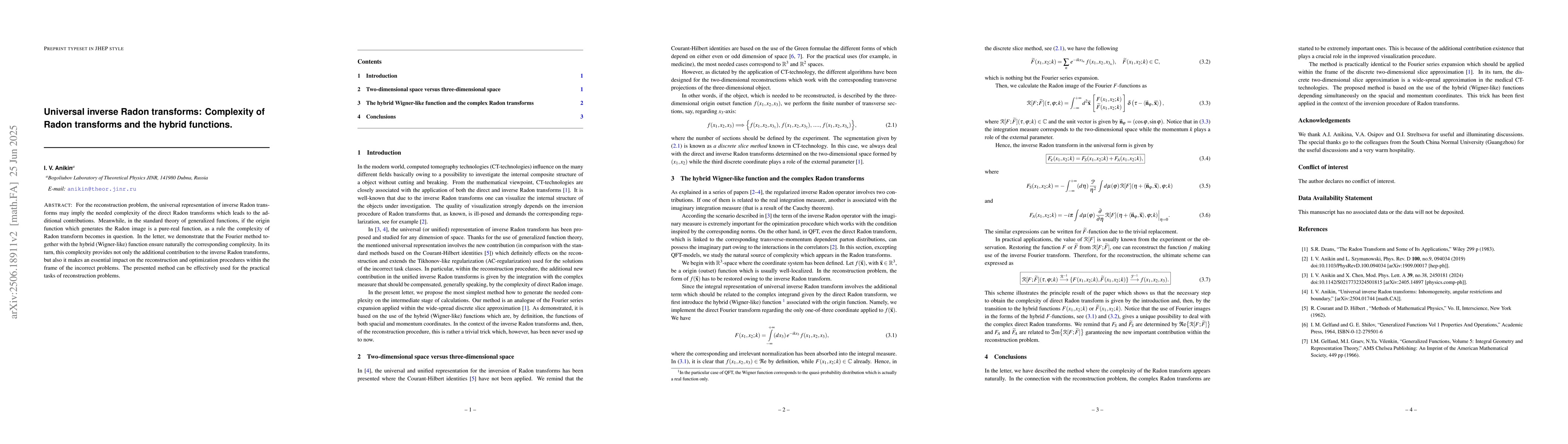 For the reconstruction problem, the universal representation of inverse Radon transforms may imply the needed complexity of the direct Radon transforms which leads to the additional contributions. Meanwhile, in the standard theory of generalized functions, if the origin function which generates the Radon image is a pure-real function, as a rule the complexity of Radon transform becomes in question. In the letter, we demonstrate that the Fourier method together with the hybrid (Wigner-like) function ensure naturally the corresponding complexity. In its turn, this complexity provides not only the additional contribution to the inverse Radon transforms, but also it makes an essential impact on the reconstruction and optimization procedures within the frame of the incorrect problems. The presented method can be effectively used for the practical tasks of reconstruction problems.