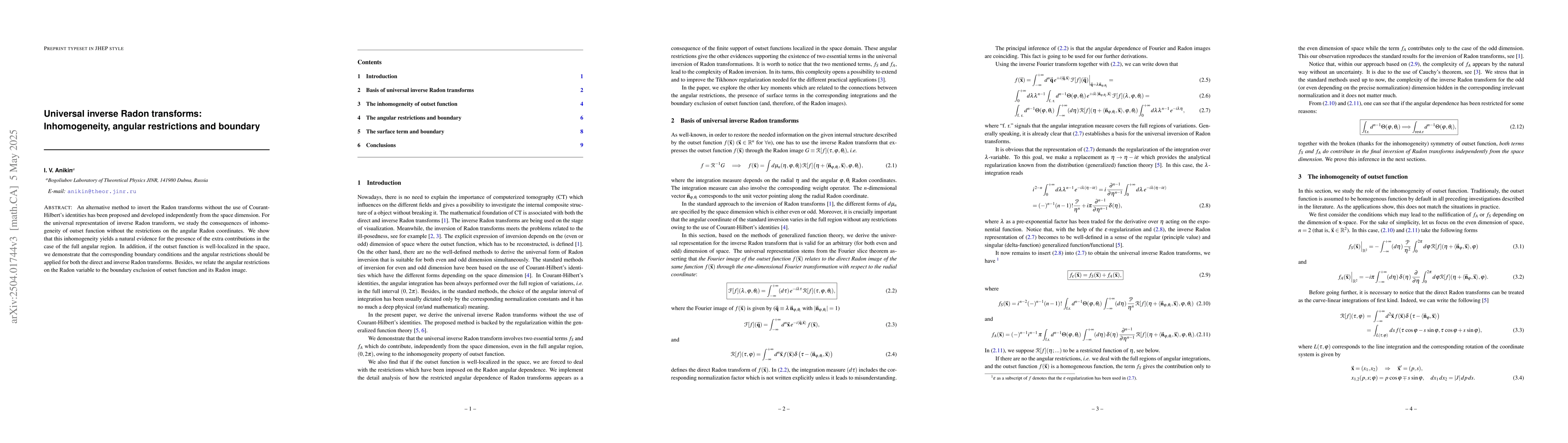 This work stands out by presenting a universal, dimension-independent approach to inverse Radon transforms, addressing inhomogeneity and relating angular restrictions to boundary conditions.