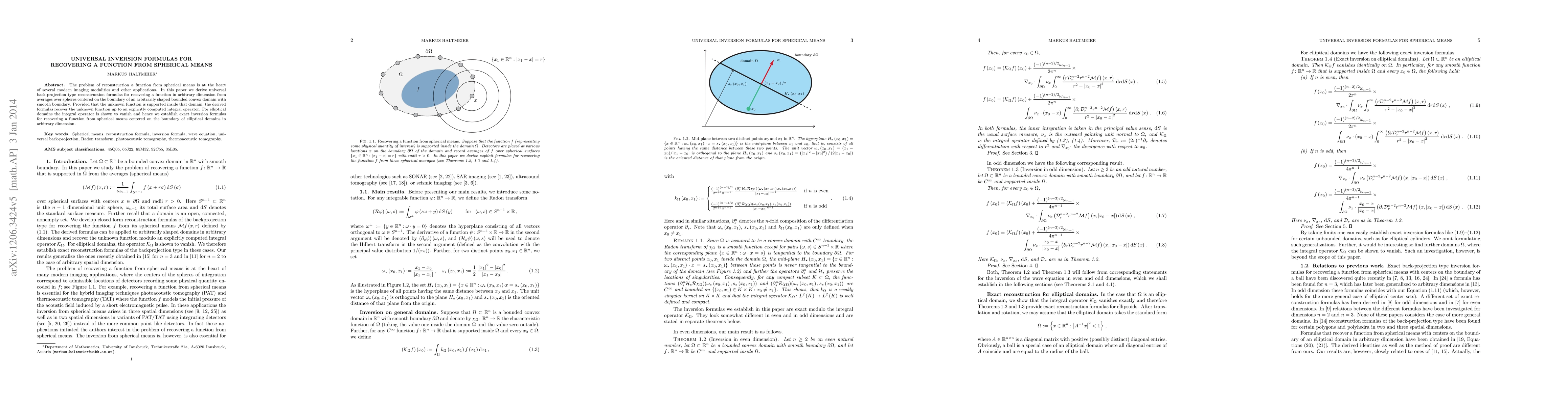The problem of reconstruction a function from spherical means is at the heart of several modern imaging modalities and other applications. In this paper we derive universal back-projection type reconstruction formulas for recovering a function in arbitrary dimension from averages over spheres centered on the boundary an arbitrarily shaped smooth convex domain. Provided that the unknown function is supported inside that domain, the derived formulas recover the unknown function up to an explicitly computed smoothing integral operator. For elliptical domains the integral operator is shown to vanish and hence we establish exact inversion formulas for recovering a function from spherical means centered on the boundary of elliptical domains in arbitrary dimension.