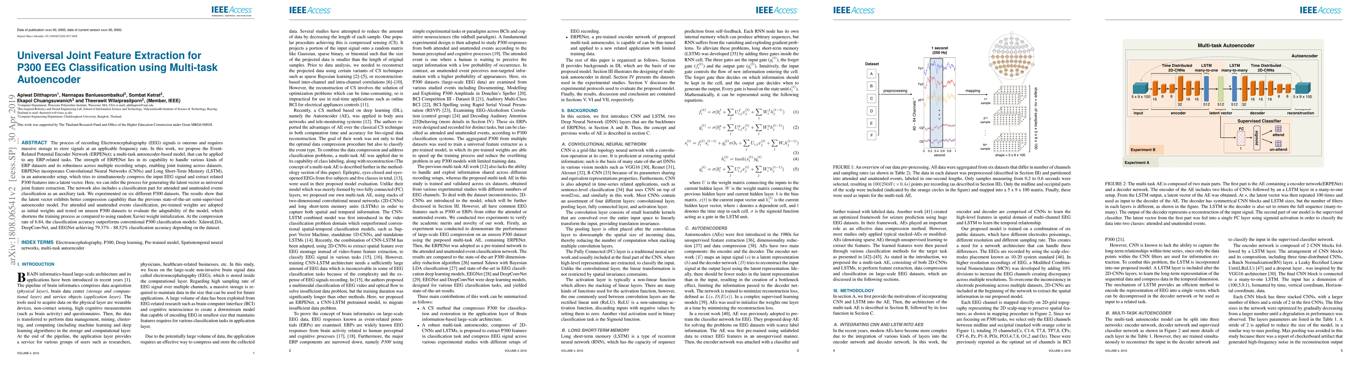 This paper proposes ERPENet, a multi-task autoencoder model combining CNNs and LSTM for universal joint feature extraction of P300 EEG signals. The model demonstrates superior compression and classification performance across multiple datasets, outperforming existing methods and reducing training time through pre-trained weights.