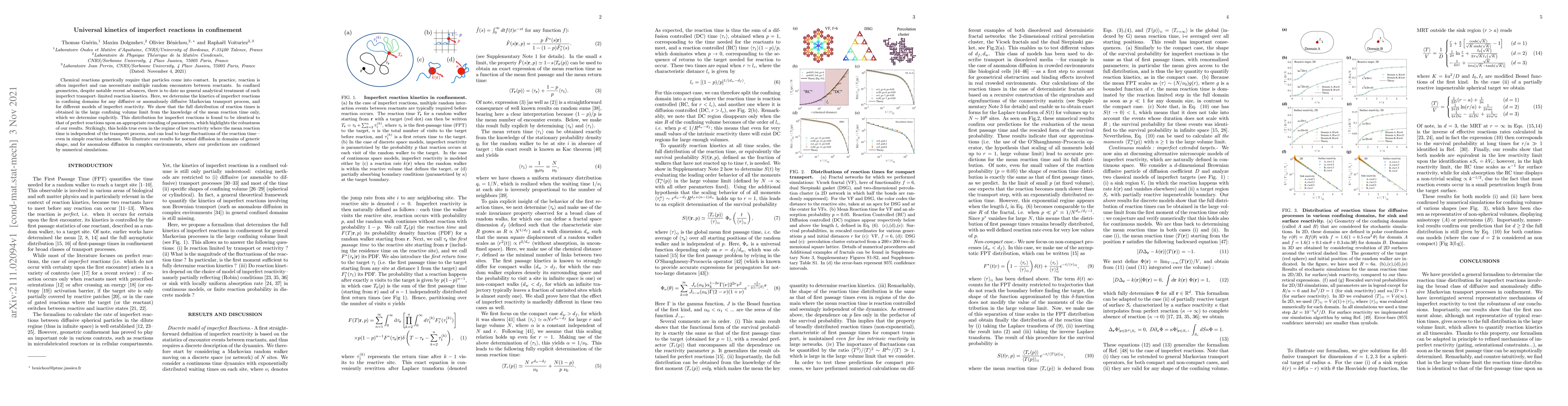 This paper develops a universal analytical framework for the kinetics of imperfect reactions in confined spaces, showing that the distribution of reaction times mirrors that of perfect reactions upon rescaling, regardless of the transport process or reactivity level. Numerical simulations validate the predictions for both normal and anomalous diffusion in various geometries.