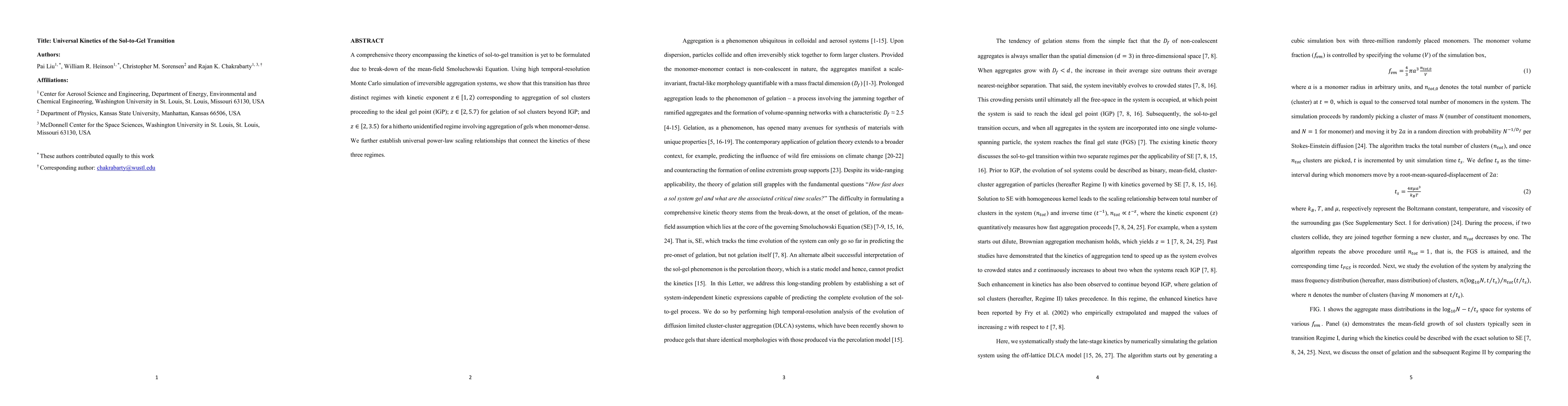 This paper presents a novel theory for the sol-to-gel transition, identifying three distinct kinetic regimes with varying kinetic exponents, and establishes universal scaling relationships connecting these regimes through high temporal-resolution Monte Carlo simulations.