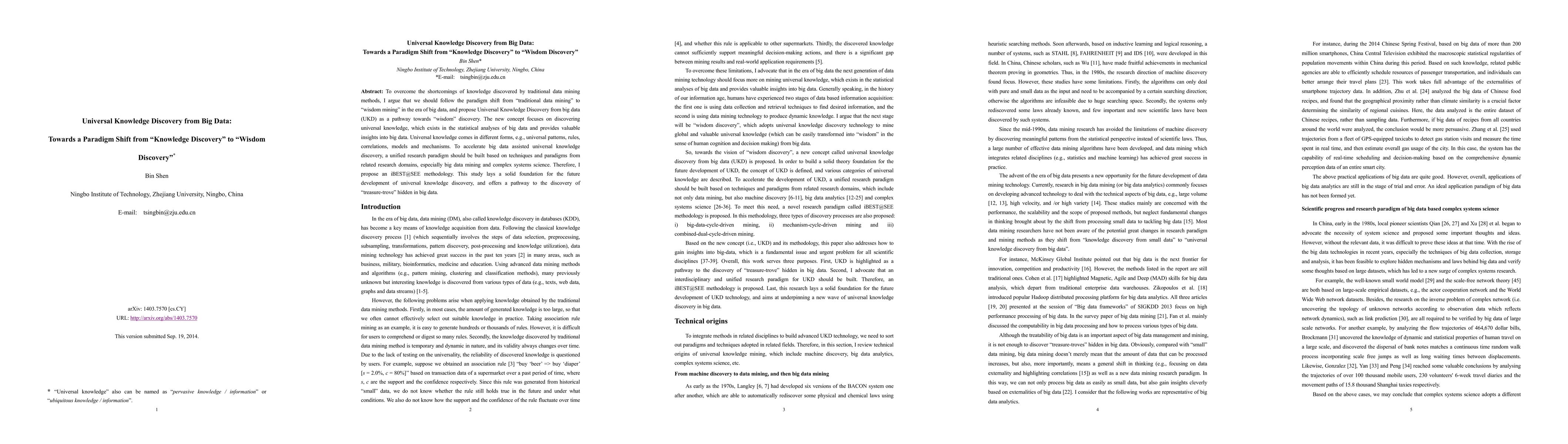This paper proposes universal knowledge discovery from big data (UKD) to transform big data into deep, valuable insights, emphasizing the need for a unified research paradigm integrating big data mining and complex systems science. The iBEST@SEE methodology is introduced to facilitate this paradigm shift from knowledge discovery to wisdom discovery.