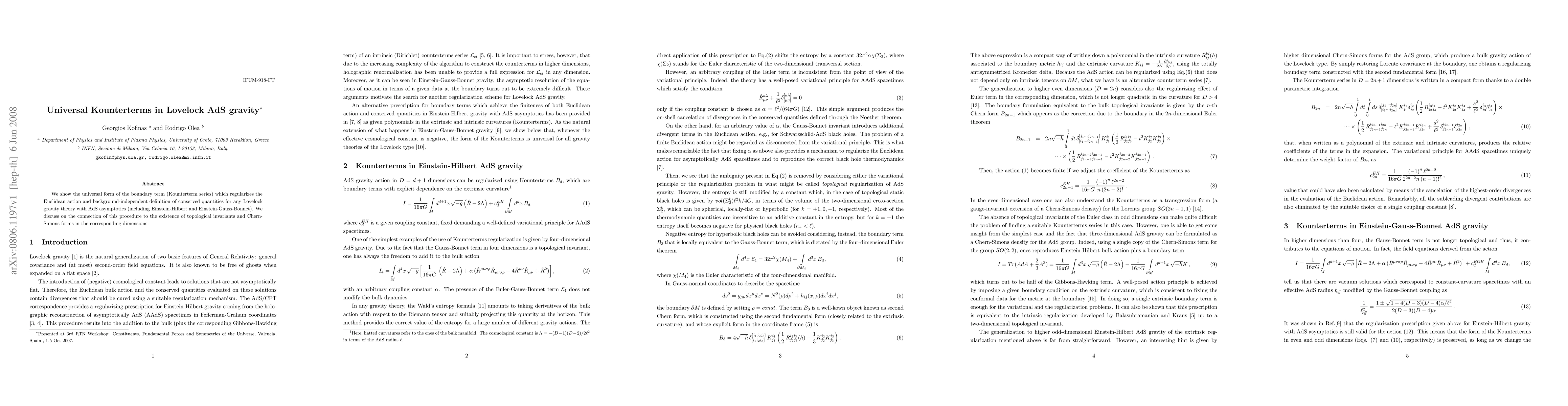 We show the universal form of the boundary term (Kounterterm series) which regularizes the Euclidean action and background-independent definition of conserved quantities for any Lovelock gravity theory with AdS asymptotics (including Einstein-Hilbert and Einstein-Gauss-Bonnet). We discuss on the connection of this procedure to the existence of topological invariants and Chern-Simons forms in the corresponding dimensions.