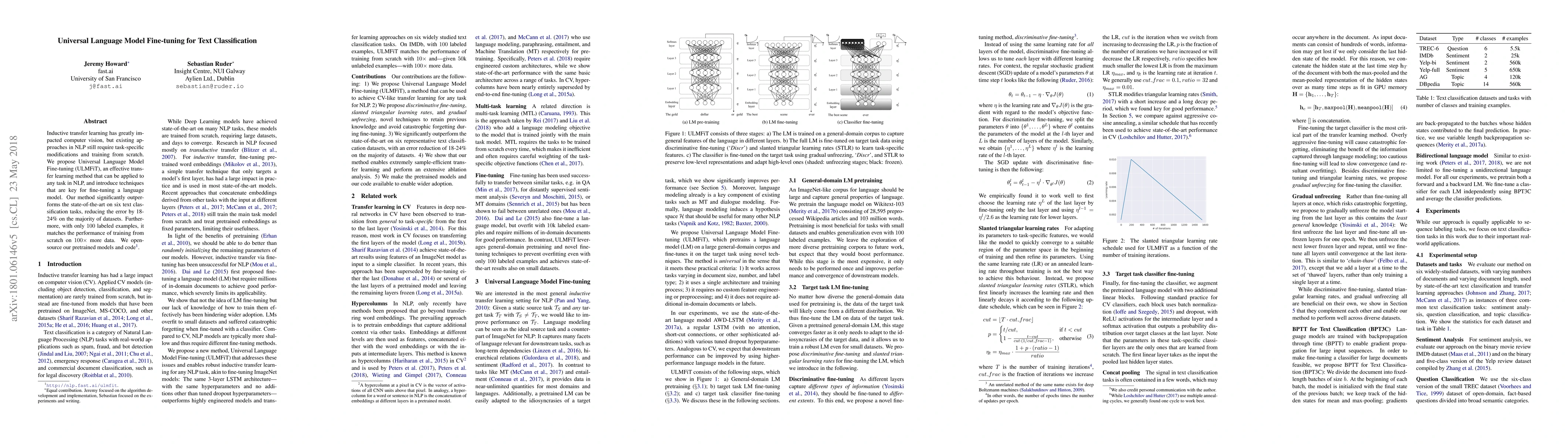 Inductive transfer learning has greatly impacted computer vision, but existing approaches in NLP still require task-specific modifications and training from scratch. We propose Universal Language Model Fine-tuning (ULMFiT), an effective transfer learning method that can be applied to any task in NLP, and introduce techniques that are key for fine-tuning a language model. Our method significantly outperforms the state-of-the-art on six text classification tasks, reducing the error by 18-24% on the majority of datasets. Furthermore, with only 100 labeled examples, it matches the performance of training from scratch on 100x more data. We open-source our pretrained models and code.