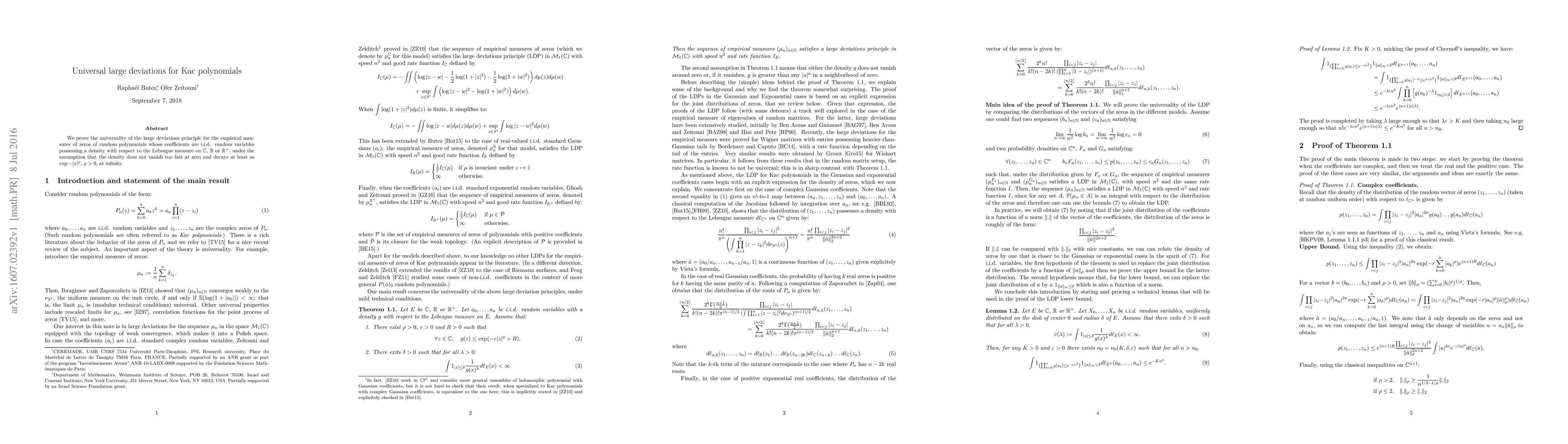 We prove the universality of the large deviations principle for the empirical measures of zeros of random polynomials whose coefficients are i.i.d. random variables possessing a density with respect to the Lebesgue measure on C, R or R + , under the assumption that the density does not vanish too fast at zero and decays at least as exp --|x| $\rho$ , $\rho$ \textgreater{} 0, at infinity.