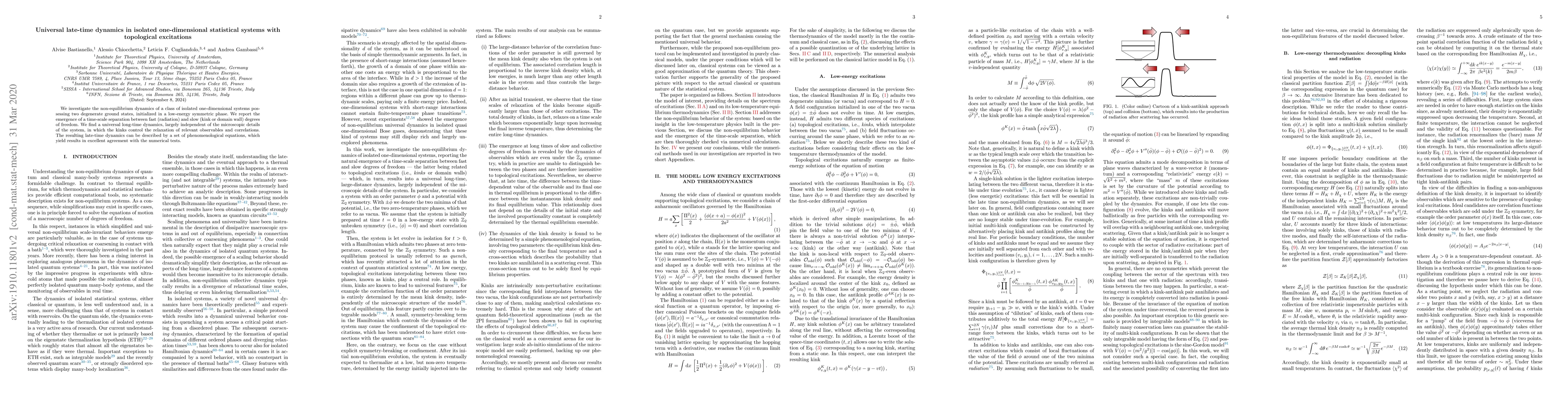 This paper explores the non-equilibrium dynamics of isolated one-dimensional systems with topological excitations, revealing a universal long-time behavior dominated by slow-moving kinks, independent of the system's microscopic details, and described by phenomenological equations. Numerical tests confirm the accuracy of these findings.