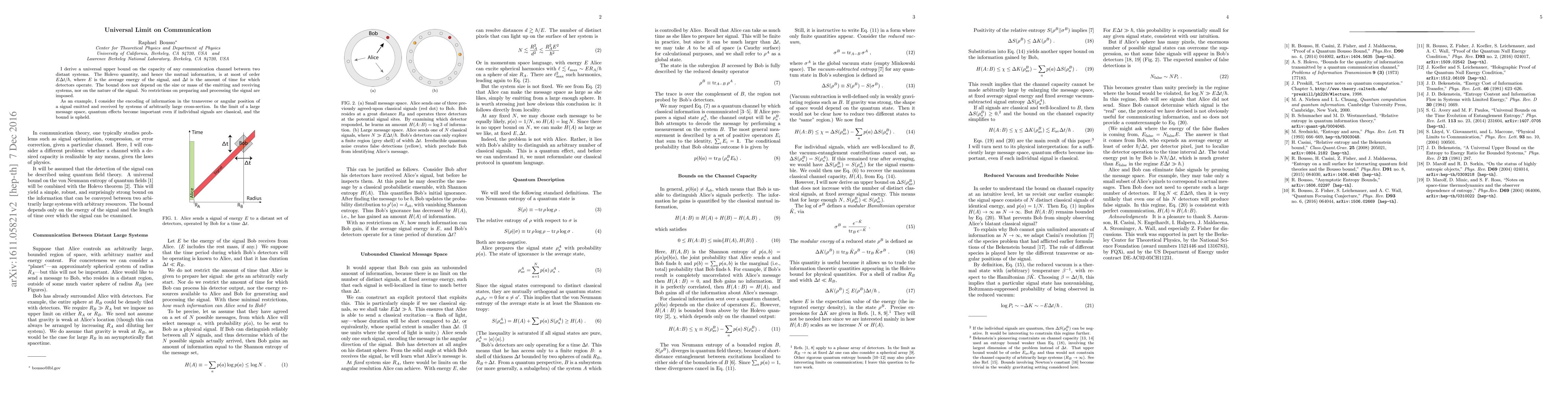 I derive a universal upper bound on the capacity of any communication channel between two distant systems. The Holevo quantity, and hence the mutual information, is at most of order $E \Delta t / \hbar$, where $E$ is the average energy of the signal, and $\Delta t$ is the amount of time for which detectors operate. The bound does not depend on the size or mass of the emitting and receiving systems, nor on the nature of the signal. No restrictions on preparing and processing the signal are imposed. As an example, I consider the encoding of information in the transverse or angular position of a signal emitted and received by systems of arbitrarily large cross-section. In the limit of a large message space, quantum effects become important even if individual signals are classical, and the bound is upheld.