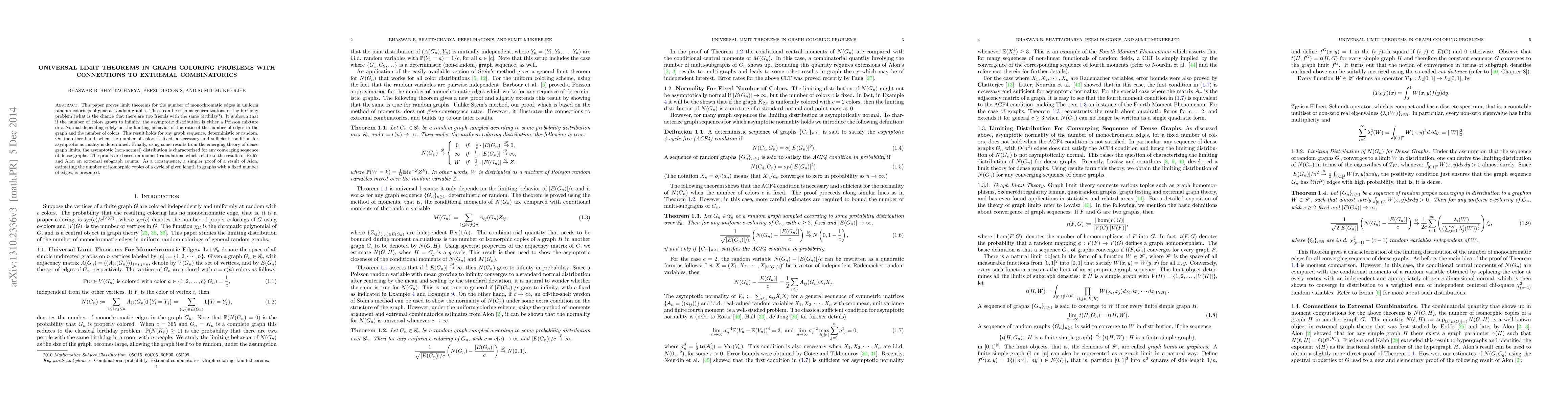 This paper proves limit theorems for the number of monochromatic edges in uniform random colorings of general random graphs. These can be seen as generalizations of the birthday problem (what is the chance that there are two friends with the same birthday?). It is shown that if the number of colors grows to infinity, the asymptotic distribution is either a Poisson mixture or a Normal depending solely on the limiting behavior of the ratio of the number of edges in the graph and the number of colors. This result holds for any graph sequence, deterministic or random. On the other hand, when the number of colors is fixed, a necessary and sufficient condition for asymptotic normality is determined. Finally, using some results from the emerging theory of dense graph limits, the asymptotic (non-normal) distribution is characterized for any converging sequence of dense graphs. The proofs are based on moment calculations which relate to the results of Erd\H os and Alon on extremal subgraph counts. As a consequence, a simpler proof of a result of Alon, estimating the number of isomorphic copies of a cycle of given length in graphs with a fixed number of edges, is presented.